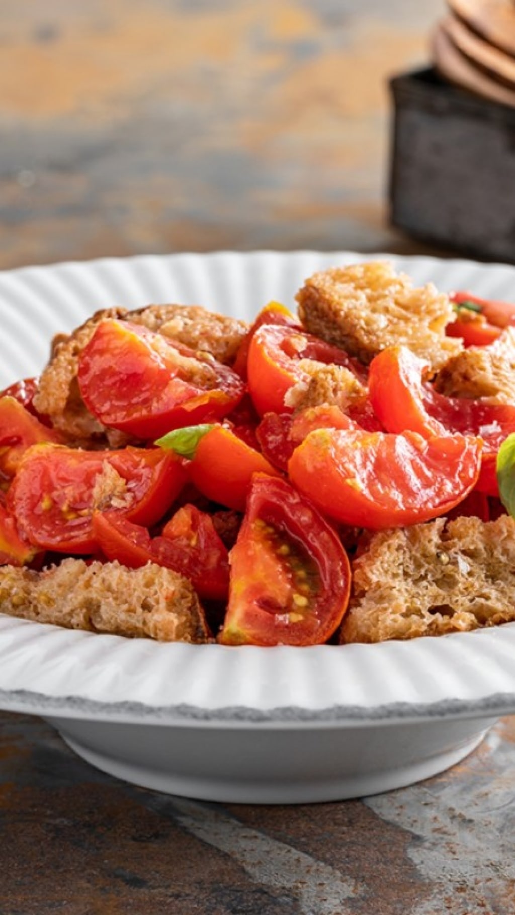 Questa insalata di pane vecchio e pomodori maturi somiglia alla panzanella ma è una versione molto più semplice e veloce. Mentre la ricetta della panzanella prevede infatti una fase di ammollo del pane (rigorosamente sciapo) in acqua e la presenza di cipolle e cetrioli fra gli ingredienti, questa insalata è più povera e serve a impiegare pane raffermo di qualunque tipo e pomodori troppo maturi.