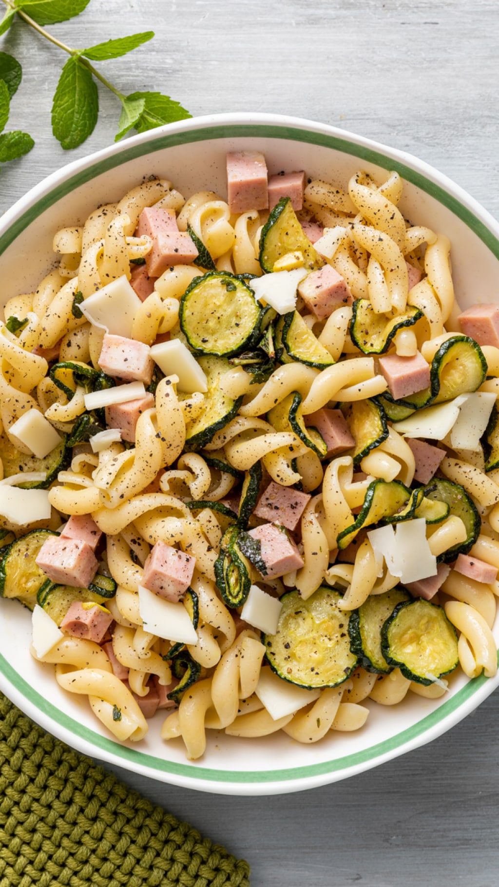 Cuocete la pasta in acqua bollente salata per il tempo di cottura indicato sulla confezione, scolatela al dente e passatela sotto l’acqua fredda per bloccarne la cottura. Trasferitela in un grande piatto da portata e conditela con un giro di olio. Aggiungete le zucchine con tutto il condimento, cercando di eliminare l’aglio, e mescolate. Unite la mortadella tagliata a cubetti e mescolate ancora.