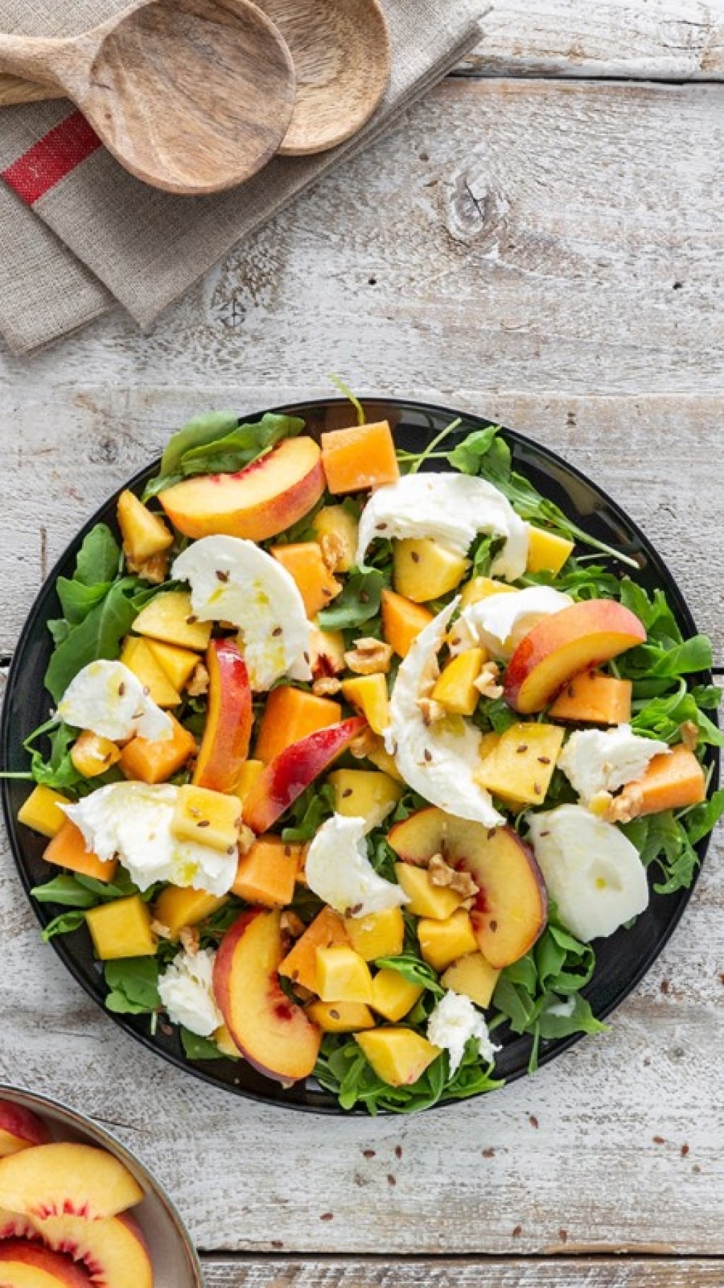 Prendete la mozzarella fiordilatte, eliminate tutta l'acqua e sfaldatela con le mani, per ridurla a straccetti. Lavate infine la rucola. Ora componete l'insalata: in un piatto da portata distribuite sul fondo la rucola, aggiungete il melone, le pesche tagliate a cubetti e quelle a spicchi. Unite anche la mozzarella e le noci grossolanamentre tritate. Condite con olio, sale e dei semi di lino.