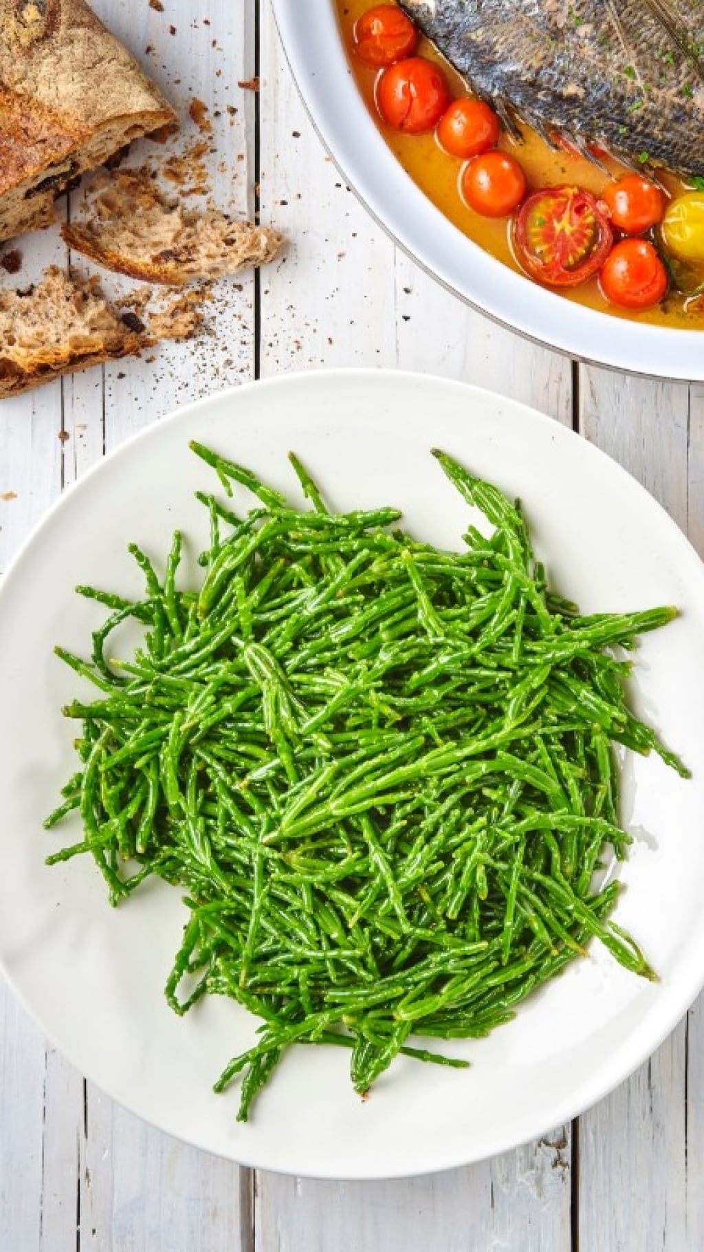 L'insalata di salicornia o insalata di asparagi di mare è un contorno dal sapore originale. Condita semplicemente con olio e limone è perfetta per accompagnare secondi piatti a base di pesce.