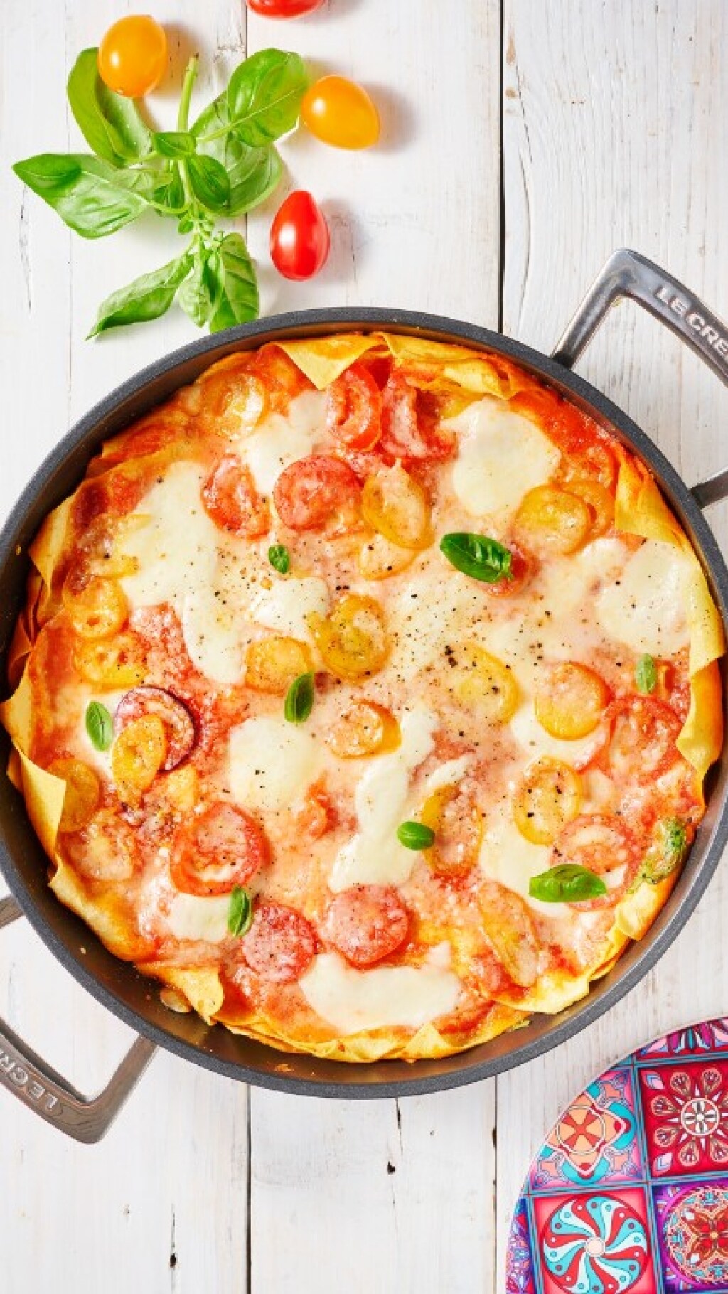 Portate a cottura con il coperchio, aggiungendo, se necessario, un paio di cucchiai d’acqua per creare vapore all'interno della padella (aiuterà la cottura delle lasagne). Quando la lasagna inizia a sobollire, abbassate la fiamma e proseguite la cottura per 12 minuti. Terminare servendo le lasagne in padella alla caprese con foglioline di basilico fresco.