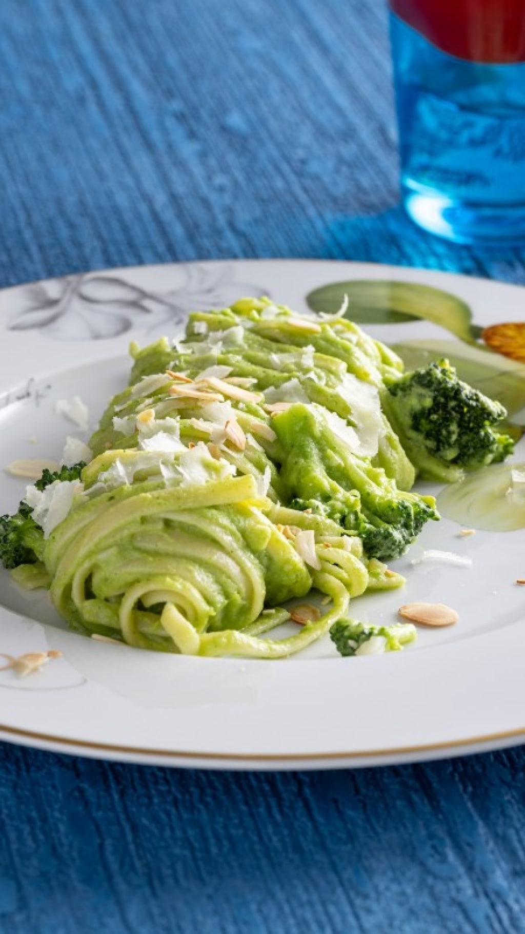 Servite con una grattugiata di pecorino e le mandorle tostate: le vostre linguine con crema di broccoli e mandorle sono pronte per essere gustate.