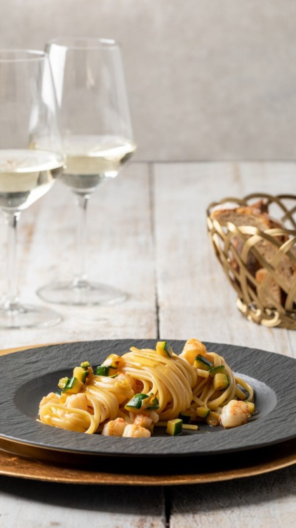 Fatevi colare sopra la salsa d'uova e mescolate velocemente. Trasferite le linguine con zucchine, mazzancolle e zabaione salato nei singoli piatti, completate con una macinata di pepe e servite subito, accompagnando con un bicchiere di Moscato d'Asti Docg.