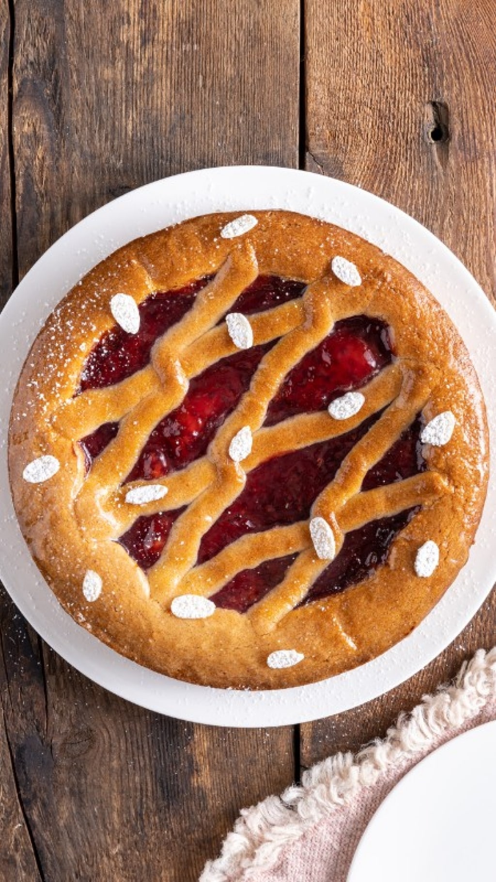 Una ricca crostata realizzata con una frolla alla farina di mandorle e aromatizzata con cannella, chiodi di garofano, scorza d'arancia e rum. Per la farcitura si usa tradizionalmente confettura di ribes rosso che con la sua punta acidula contrasta meravigliosamente la dolcezza del tutto.