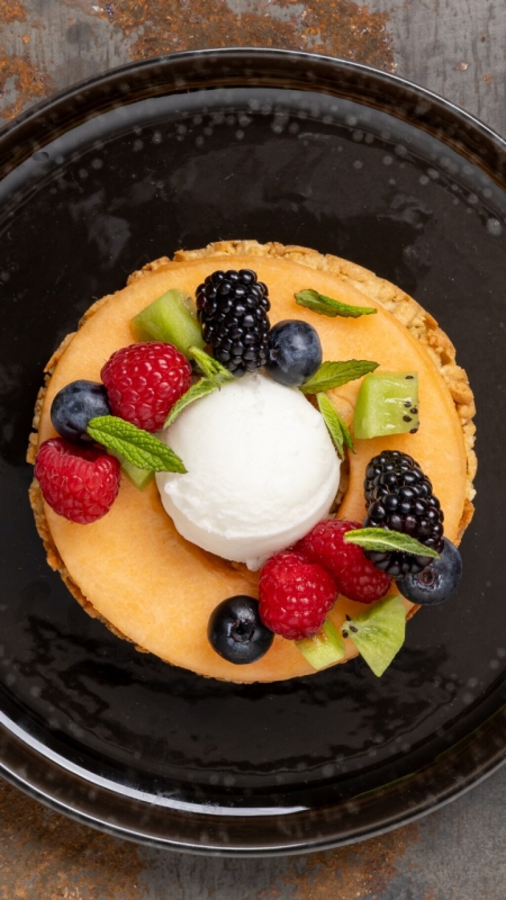 Per la macedonia, abbiamo scelto un disco di melone come base protagonista, con un foro al centro per accogliere in modo elegante il sorbetto al limone di Sicilia Amo Essere Eccellente. Attorno, kiwi, frutti di bosco e menta aggiungono freschezza e colore, creando un piacevole contrasto con la dolcezza del melone.