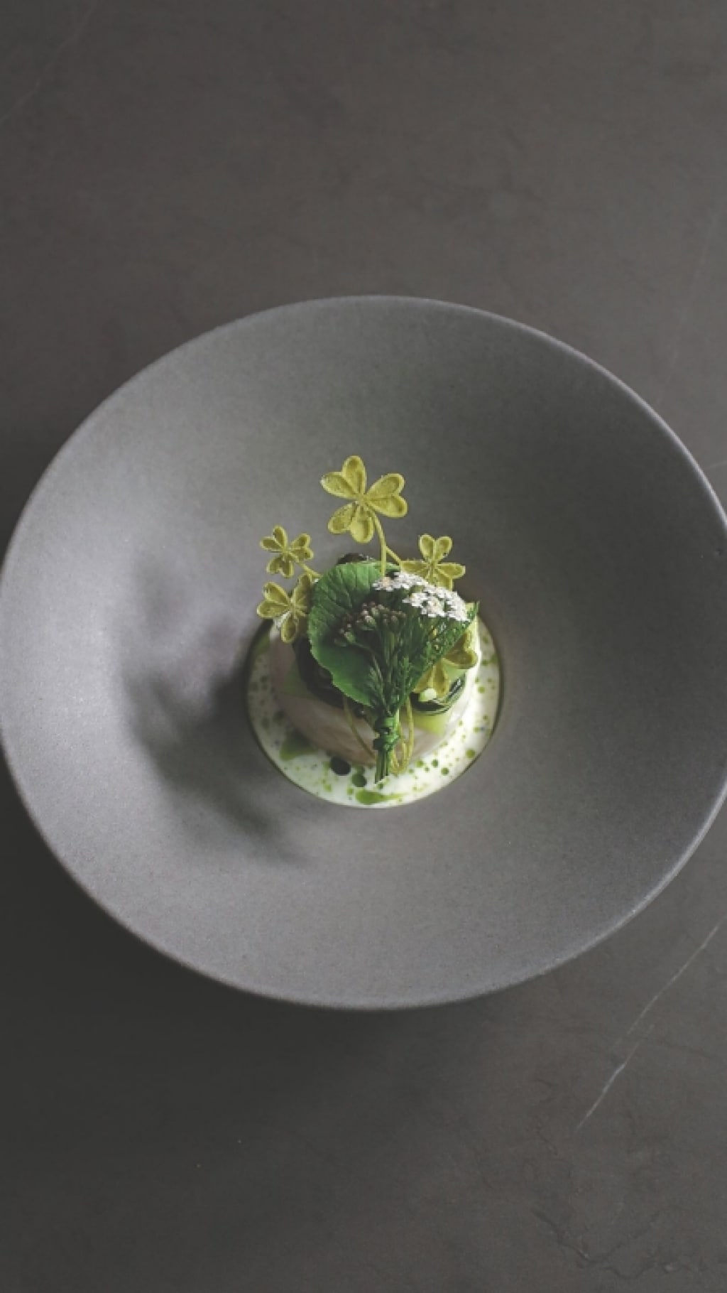Merito dell'estetica, dei suoi toni del verde e del grigio che si fondono in un risultato armonioso ed elegante e del contrasto di consistenze e temperature che esalta questo secondo sorprendente.