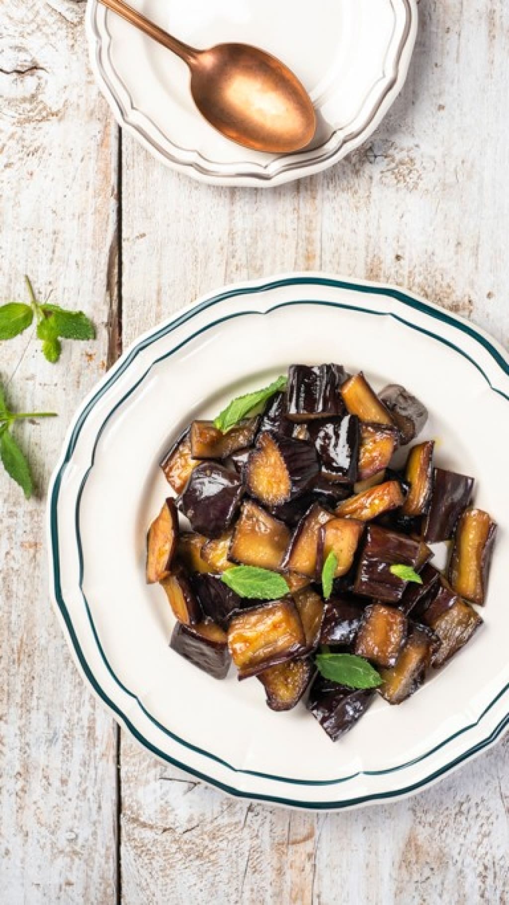 Togliete dal fuoco, trasferite le melanzane in una ciotola e fatele raffreddare. Quando si saranno raffreddate completamente unite le foglioline di menta, mescolate e fate riposare in frigorifero per qualche ora, meglio ancora se per tutta una notte. Servite le melanzane agrodolci in padella fredde da frigorifero o a temperatura ambiente, secondo i vostri gusti.