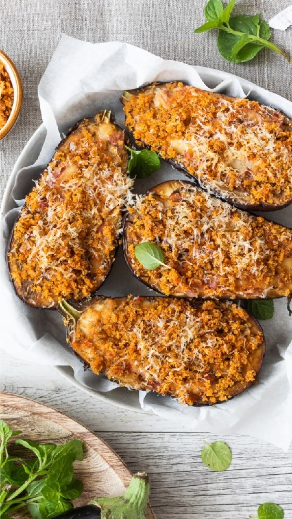 Le melanzane ripiene con prosciutto e scamorza sono un secondo piatto molto gustoso. Le melanzane vengono tagliate a metà, incise nella polpa, fatte appena ammorbidire al microonde e poi farcite con sottili fette di prosciutto e formaggio. Ricoperte da un pesto sfizioso e croccante, molto profumato per la presenza di menta fresca, vengono infine fatte gratinare in forno.
