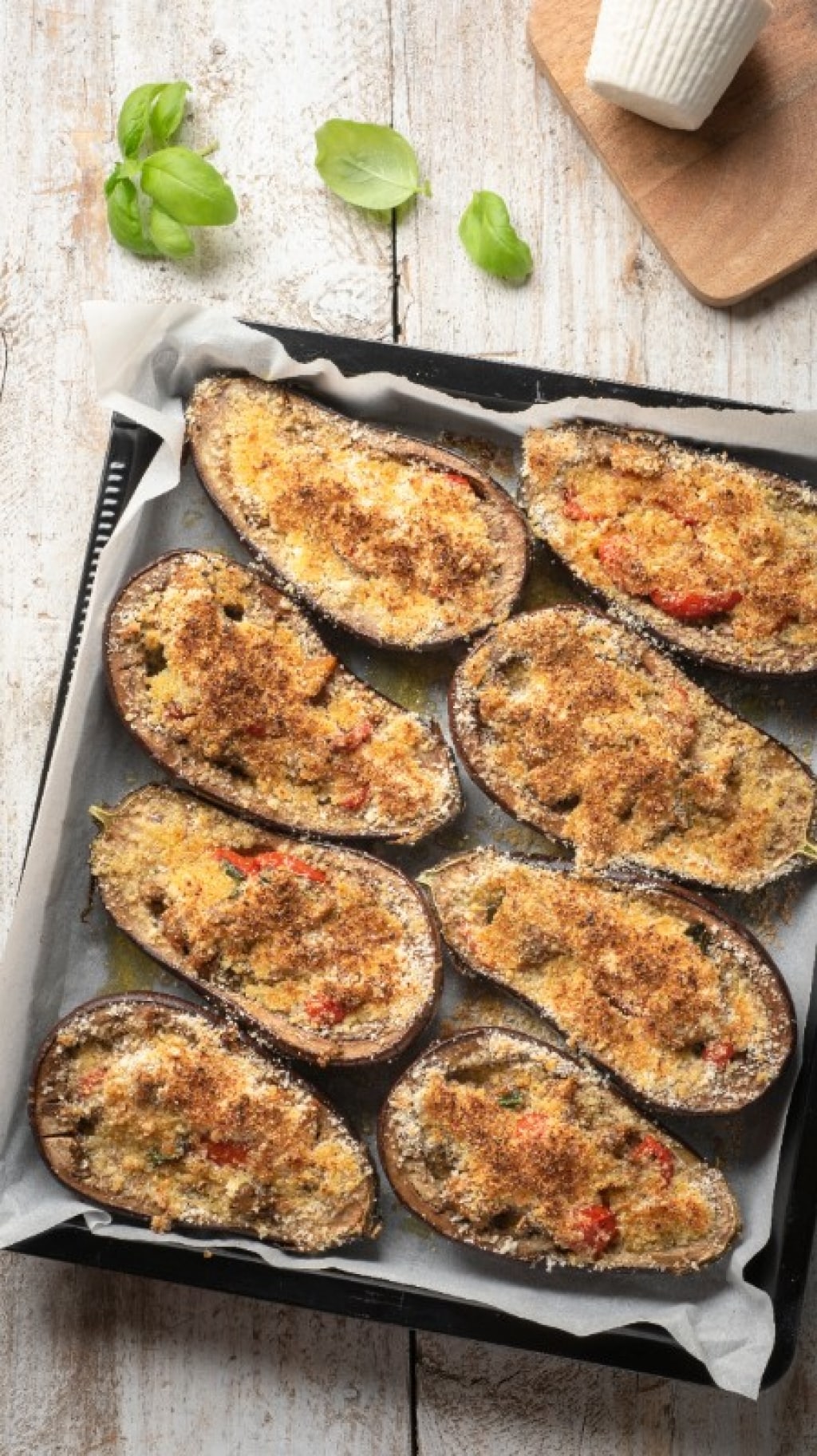 Iniziate a farcire le vostre melanzane con il ripieno preparato precedentemente. Spolverate con il mix di ricotta e pangrattato. Infornate con il grill in modalità forno ventilato per alcuni minuti, fino a doratura della superficie.