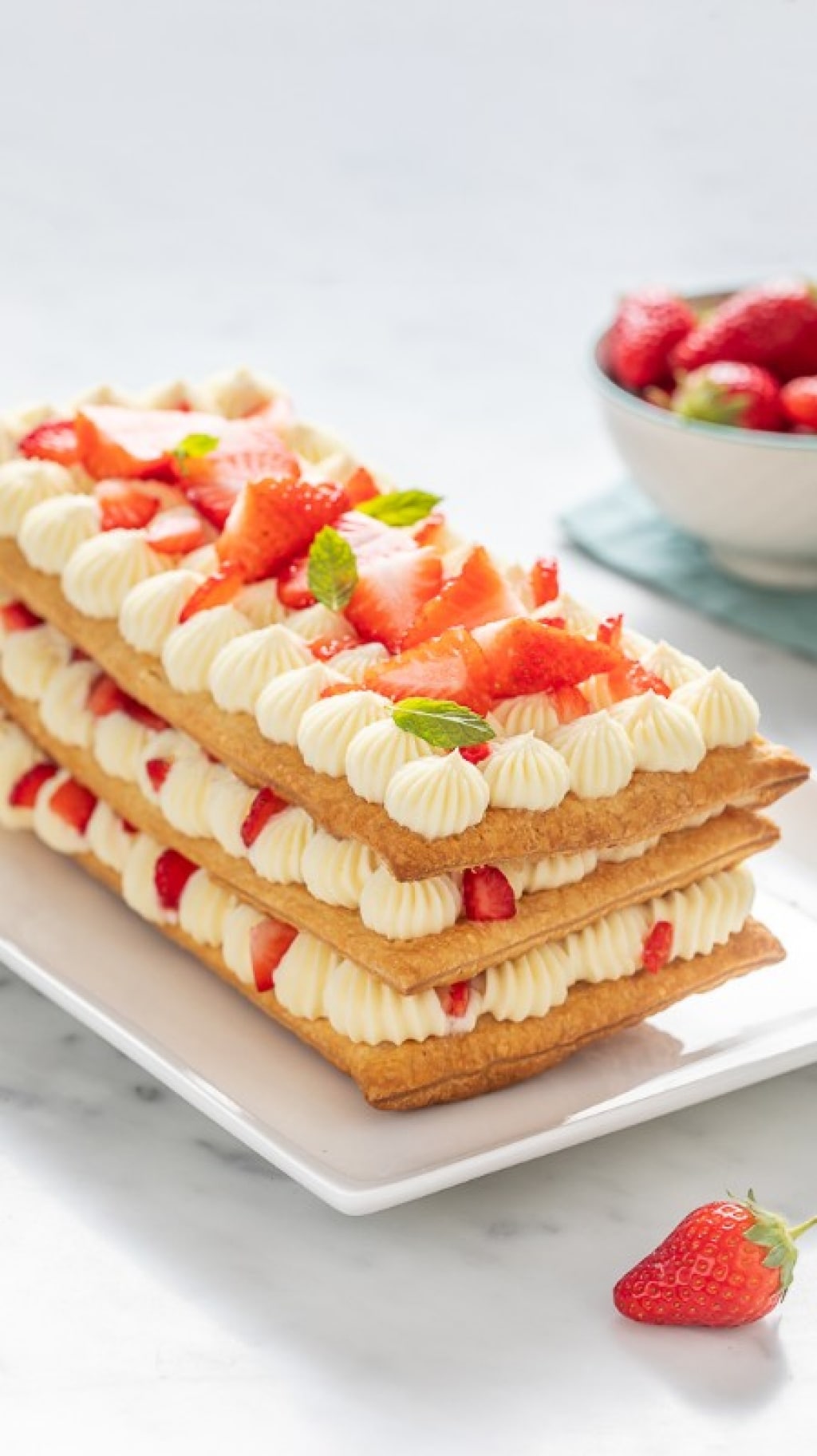 Un dessert scenografico, goloso e delicato che prevede anche una ricetta facile, partendo dalla pasta sfoglia gà pronta. Il dolce è infatti composto da tre strati di sfoglia, intervallati e decorati da una voluttuosa crema di panna e mascarpone al cioccolato bianco e tante fragole profumate. Impossibile resistergli.
