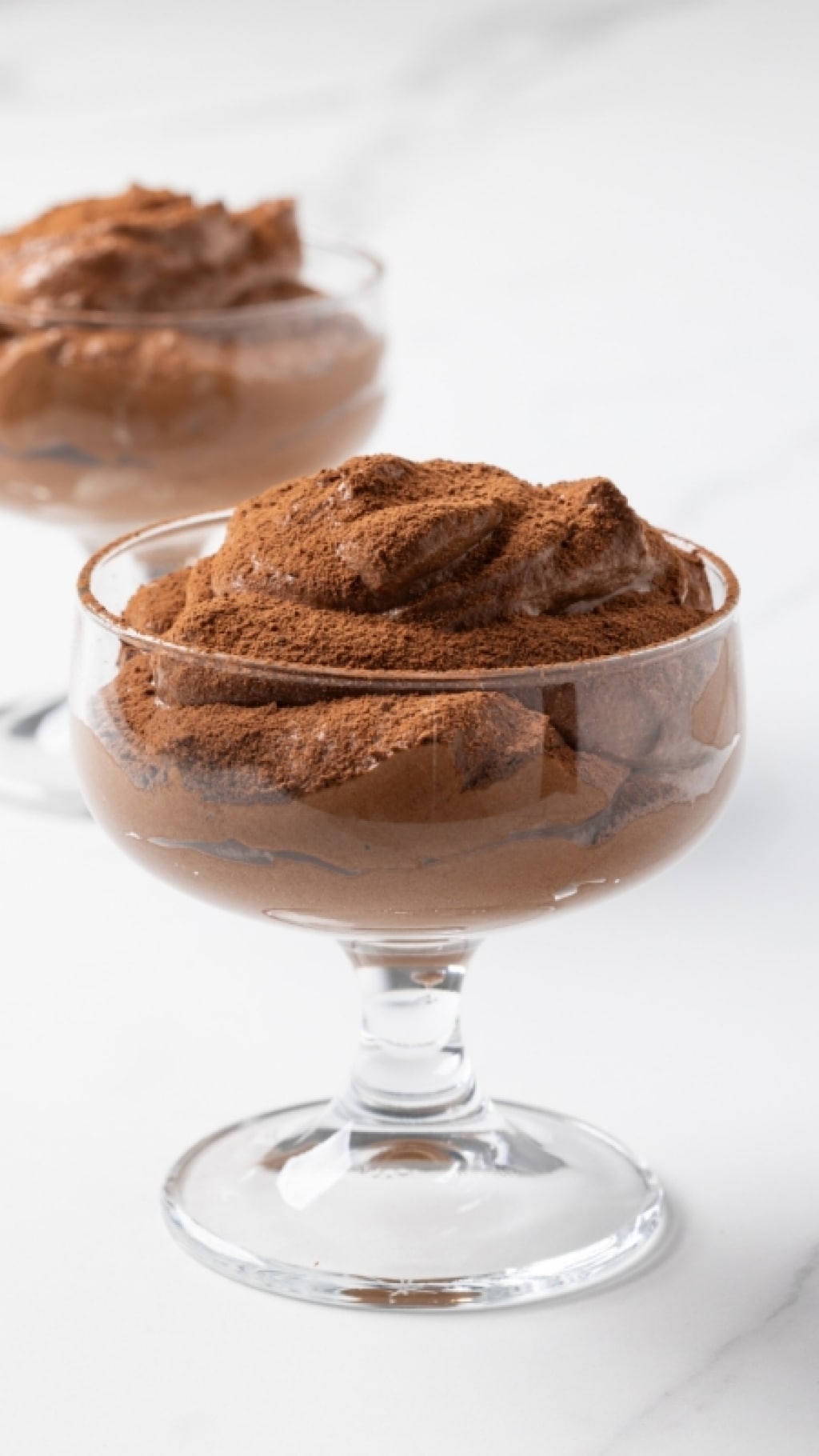 Ottenuta una consistenza leggera e omogenea, la mousse al cioccolato senza uova è pronta per essere gustata, servitela in coppette o bicchieri monoporzione con una spolverata di cacao amaro in superficie!