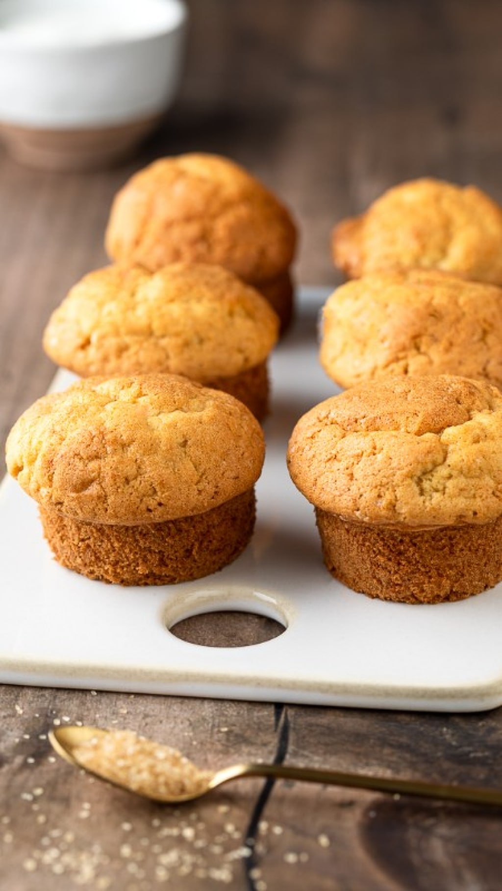 Tra gli ingredienti di questi muffin semplici ci sono yogurt al naturale, che contribuisce a renderli soffici e zucchero di canna che conferisce all'impasto un colore leggermente brunito e una dolcezza lieve.