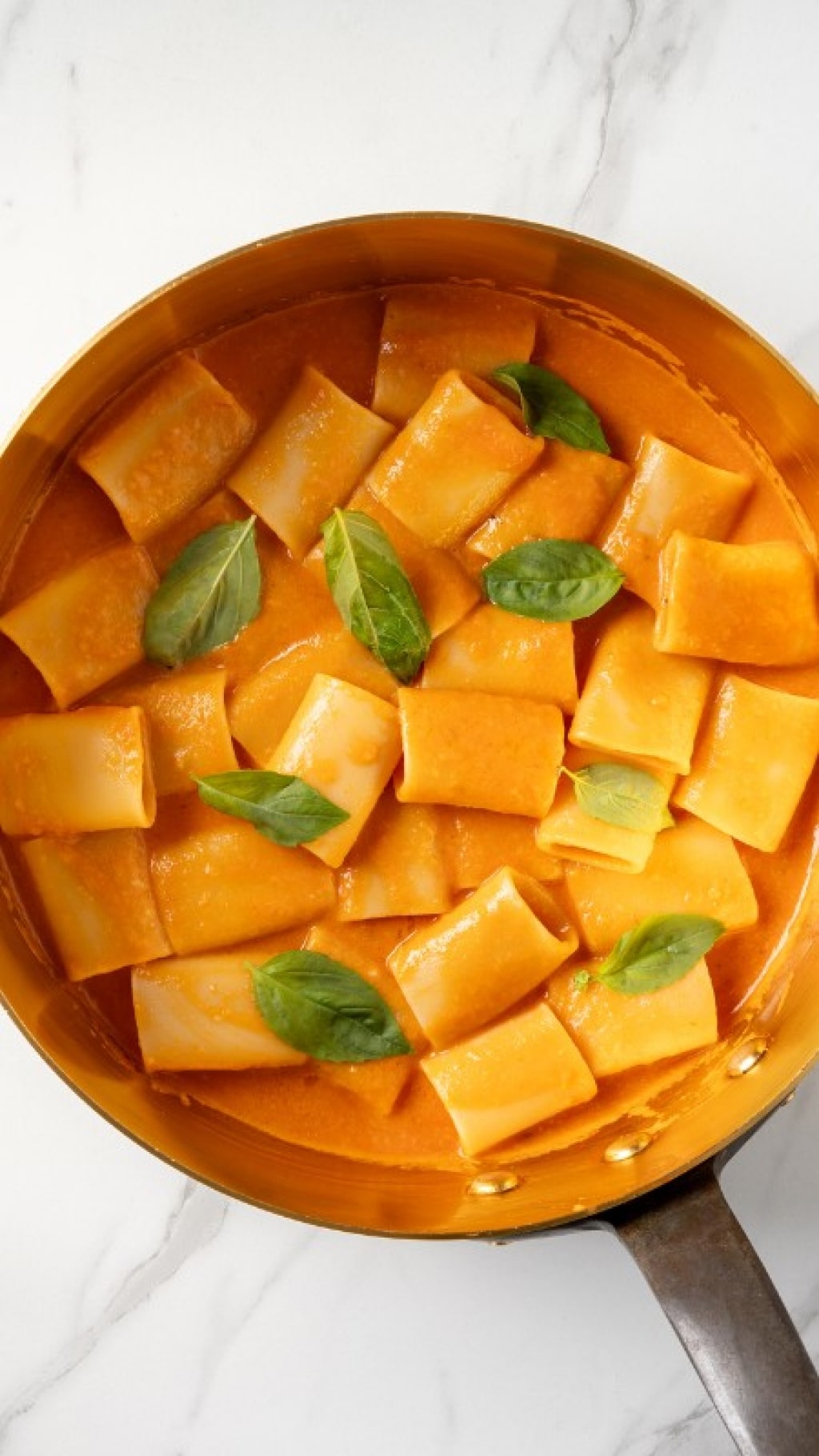 I paccheri alla Vittorio sono paccheri al sugo di pomodoro - anzi, ai tre pomodori - cremosi e profumati grazie alla mantecatura con poco burro e al tocco fresco e immancabile di foglie di basilico.