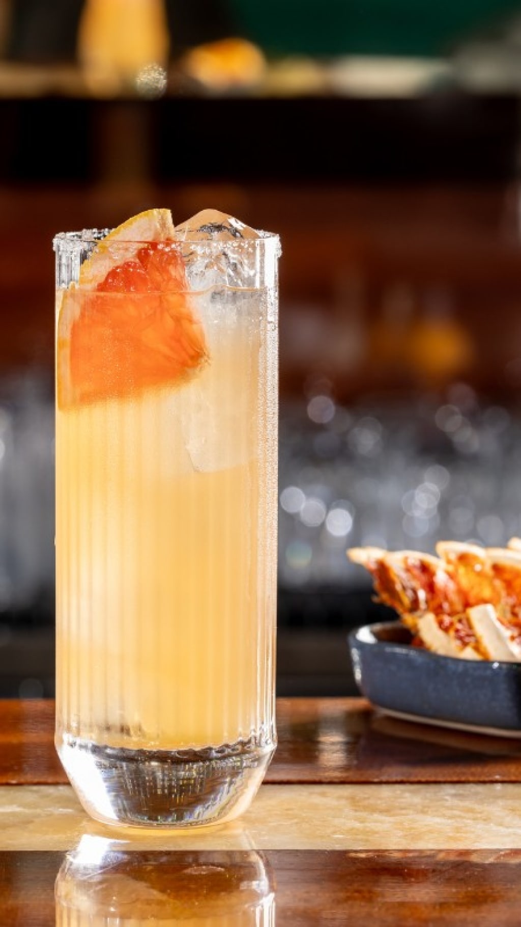 Preparate il paloma bagnando il bordo di un tumbler alto con una fettina di pompelmo. Intingete il bicchiere a testa in giù in una ciotolina con del sale per sporcarne il bordo.