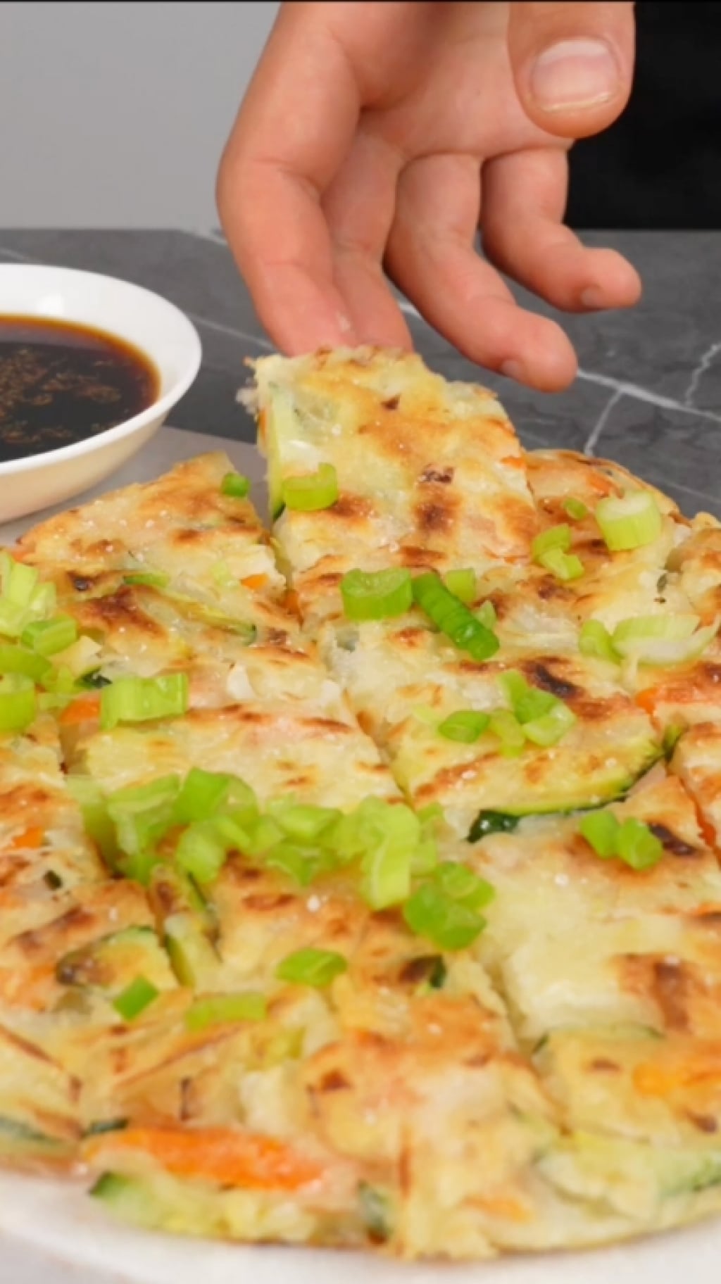 E una volta pronto, tagliatelo in quadrotti e gustatelo a morsi. Accompagnatelo con la sua deliziosa salsina a base di zenzero e salsa di soia, un esplosione di gusto fresco e speziato. Il pancake coreano è un’idea originale e conviviale davvero difficile da non amare!