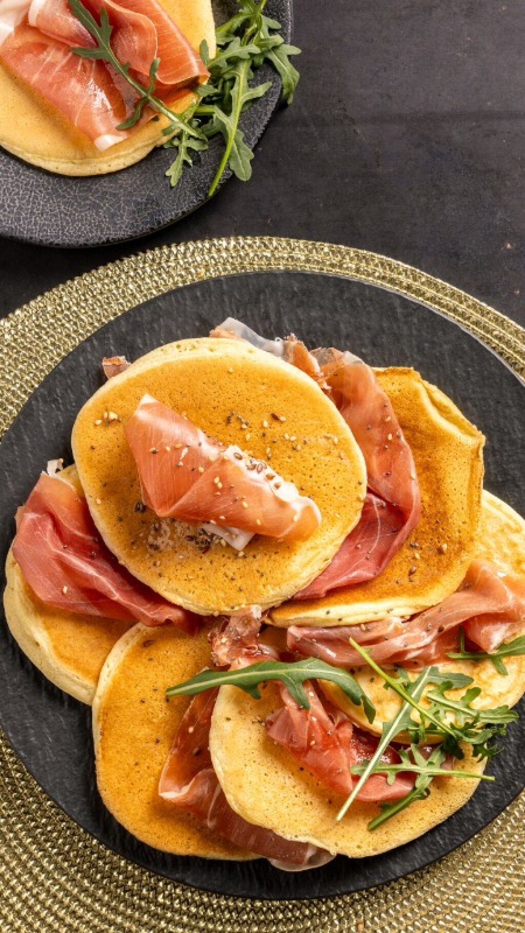 Impiattate i pancake guarnendoli con le fette di prosciutto crudo, a piacere potete aggiungere della rucola croccante, un giro di miele e dei semi misti. I pancake salati con prosciutto crudo sono pronti, buon appetito!