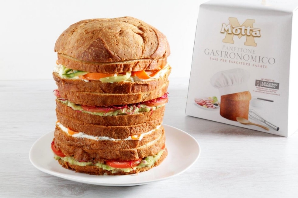 Ripetete entrambi gli strati con gli stessi ingredienti, poi chiudete con la calotta. Tagliate il panettone gastronomico in quattro parti, partendo dalla calotta e scendendo verso il fondo.