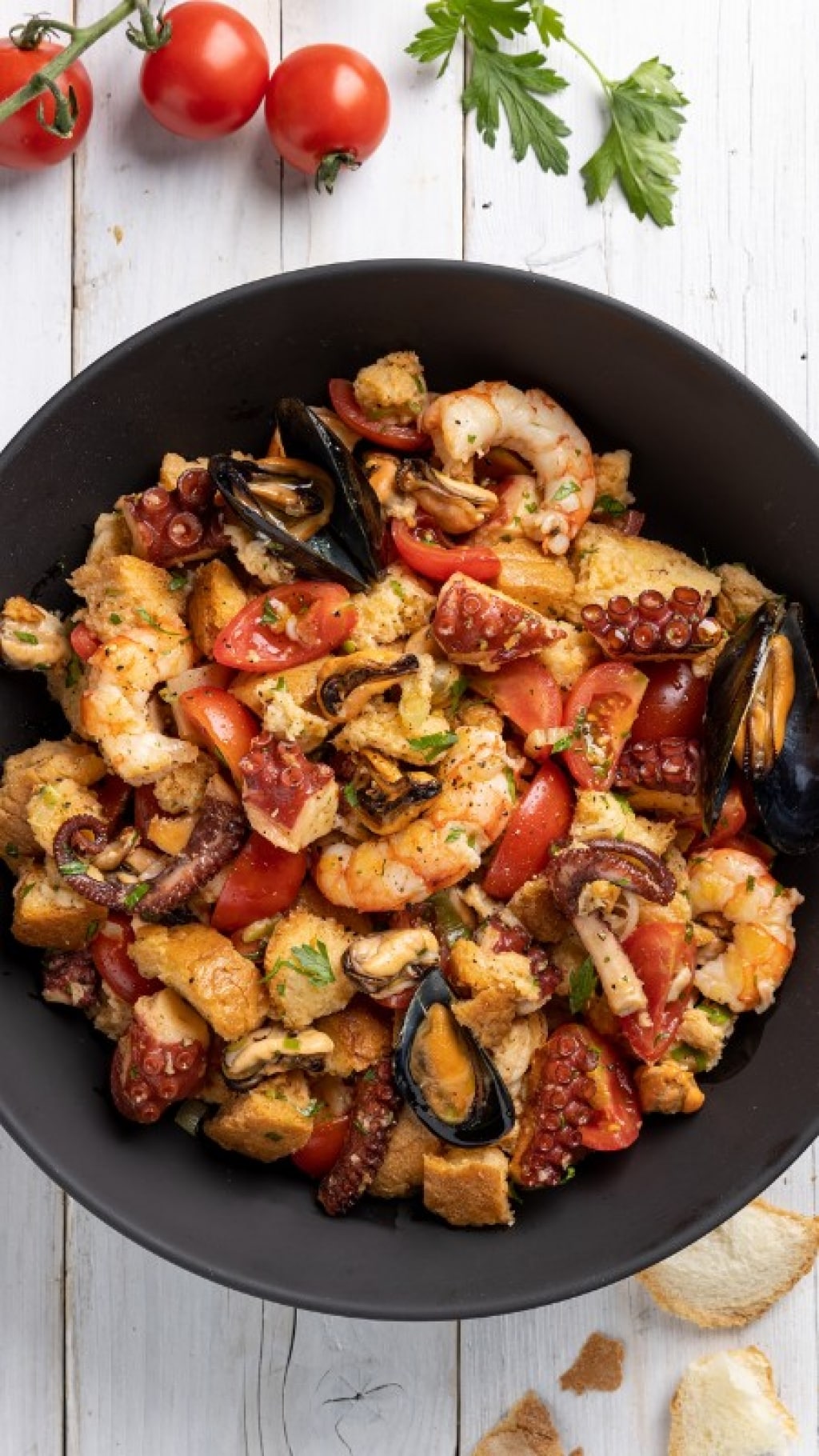 La ricetta della panzanella di mare è una rivisitazione a base di pesce della panzanella tradizionale, con cozze, polpo e gamberi. Il risultato è un piatto estivo sfizioso e originale perfetto per una cena in famiglia o con gli amici.