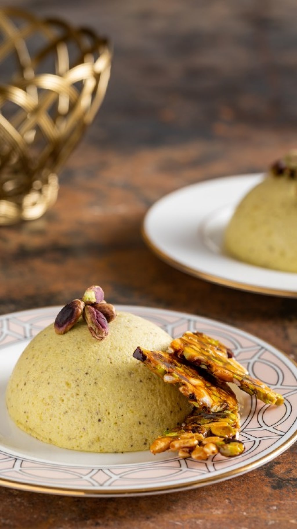 Versate negli stampi monoporione il composto così ottenuto e riponetelo in freezer a congelare per circa 8 ore. Successivamente preparate il croccante iniziando a caramellare lo zucchero e il miele lentamente, fino a raggiungere 160° C. A parte tagliate grossolanamente i pistacchi e teneteli caldi nel forno insieme al riso soffiato a circa 60° C.