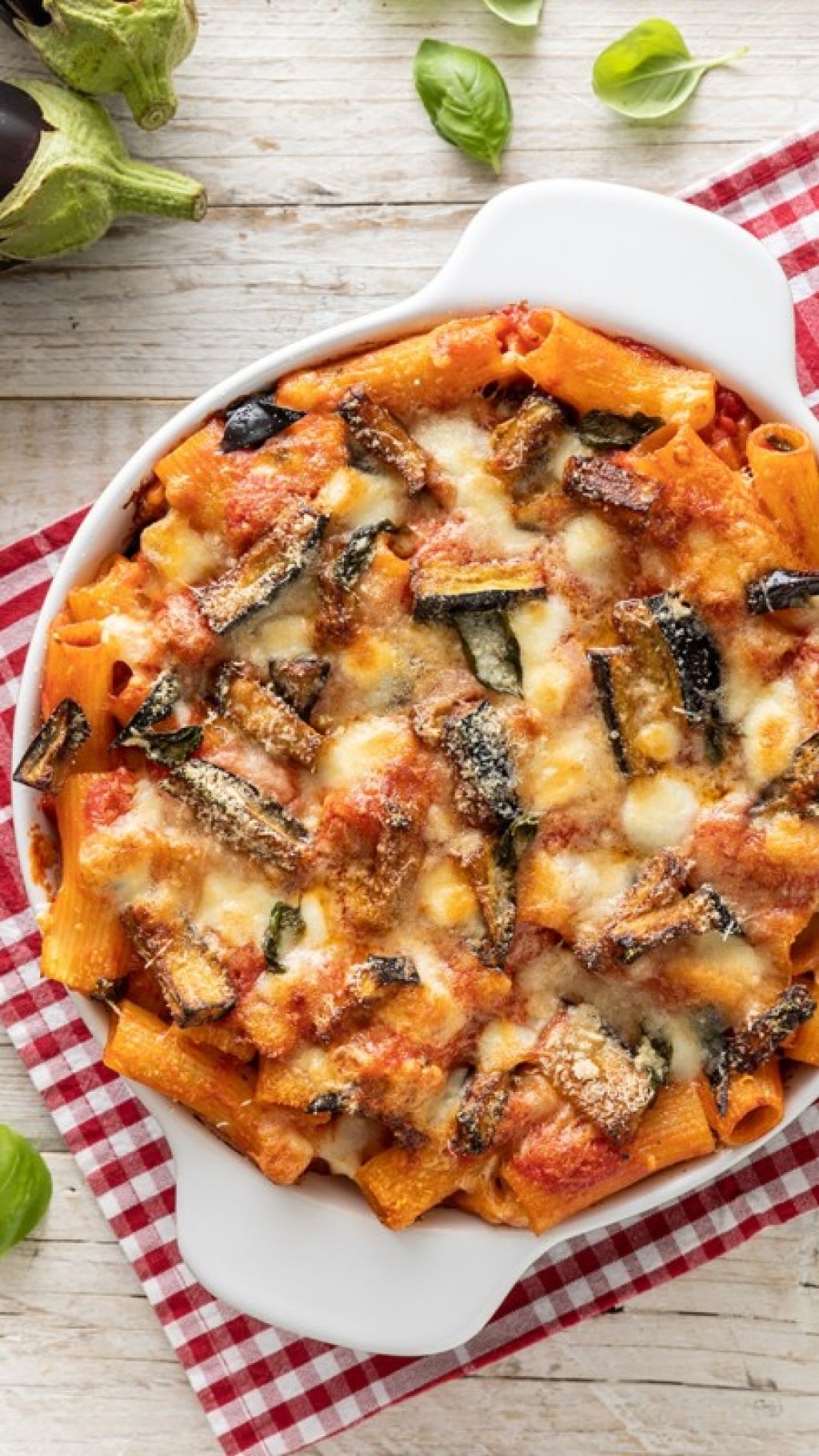Questa pasta al forno è facile da realizzare e prevede pasta corta condita con un semplicissimo sugo di pomodoro, melanzane fritte e mozzarella fiordilatte (o provola in alternativa). Su tutto il profumo del basilico e tanto formaggio grattugiato. La cottura al forno ne determina il successo, creando una consistenza filante all'interno e un'irresistibile crosticina in superficie.
