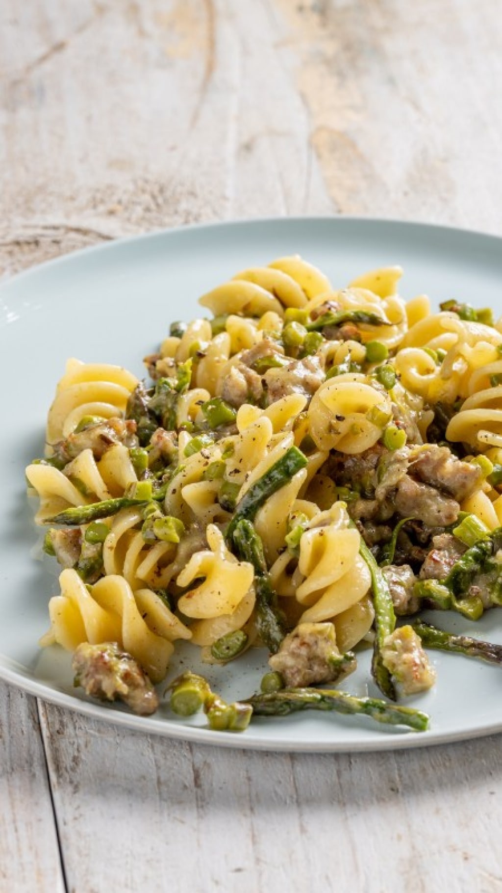 La pasta con asparagi e salsiccia è un primo piatto che abbina il sapore inconfondibile degli asparagi al carattere piú rustico di salsiccia e pecorino. Tre ingredienti che in questa ricetta facile si incontrano con successo.