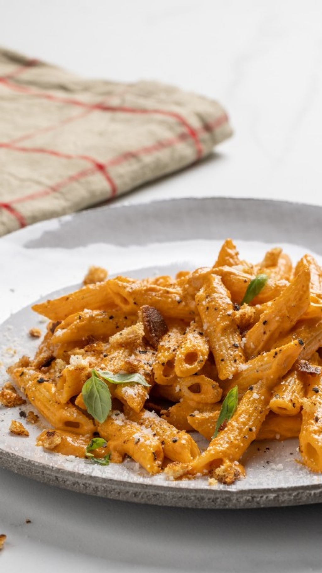 Intanto cuocete le penne in abbondante acqua bollente salata e, una volta cotte e scolate, amalgamatele in una ciotola capiente insieme alla crema di peperoni. Mescolate bene la pasta con la crema e dunque impiattate. Se volete dare una nota croccante vi suggeriamo di aggiungere sul piatto qualche briciola di pane tostato.