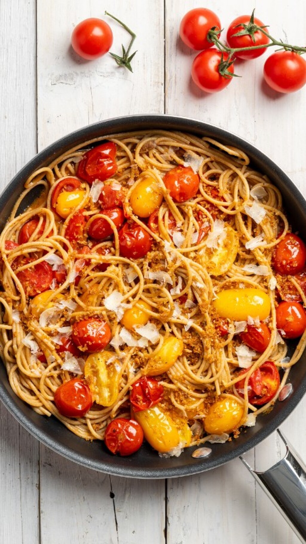 Cuocete gli spaghetti integrali al dente, poi terminate la cottura in padella aggiungendo i pomodorini arrosto con il sughetto che avranno rilasciato e un po’ di acqua di cottura della pasta. Completate con il pane tostato condito e scaglie di parmigiano a piacere.