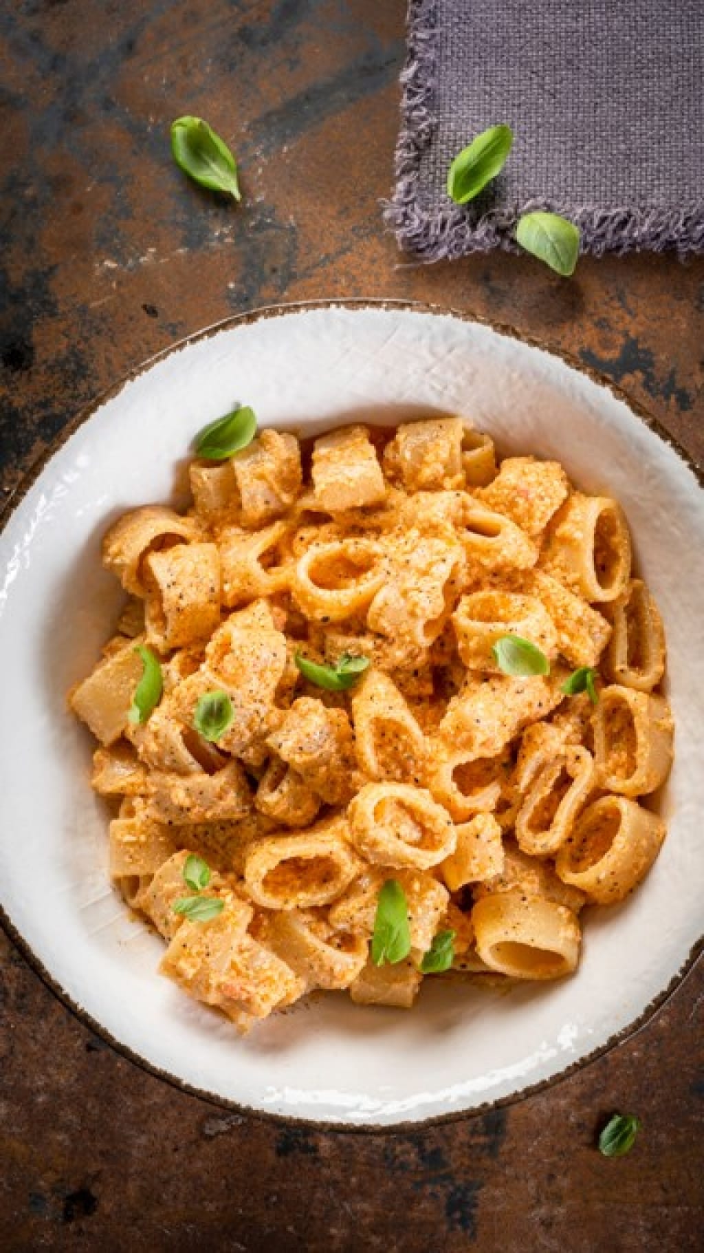 Al momento di servire guarnite la pasta fredda con pesto alla siciliana con una spolverata di pepe e foglioline di basilico fresco a piacere.