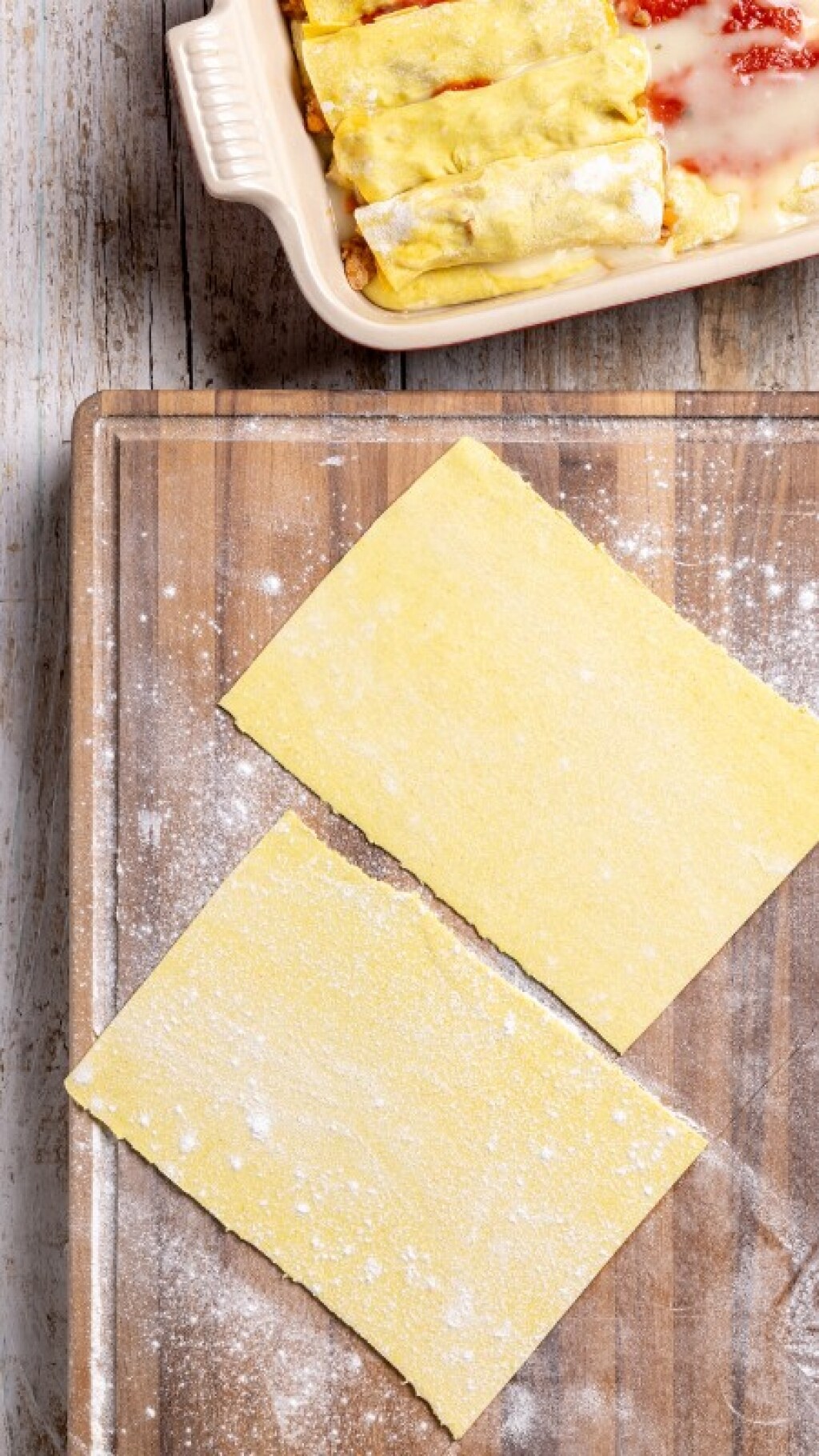 Che sia per tagliatelle, ravioli o altri formati, la pasta fatta in casa è la base ideale per portare in tavola il gusto autentico della tradizione. Con quest'impasto potete realizzare una ventina di cannelloni freschi senza uova da farcire con ingredienti classici o più particolari.