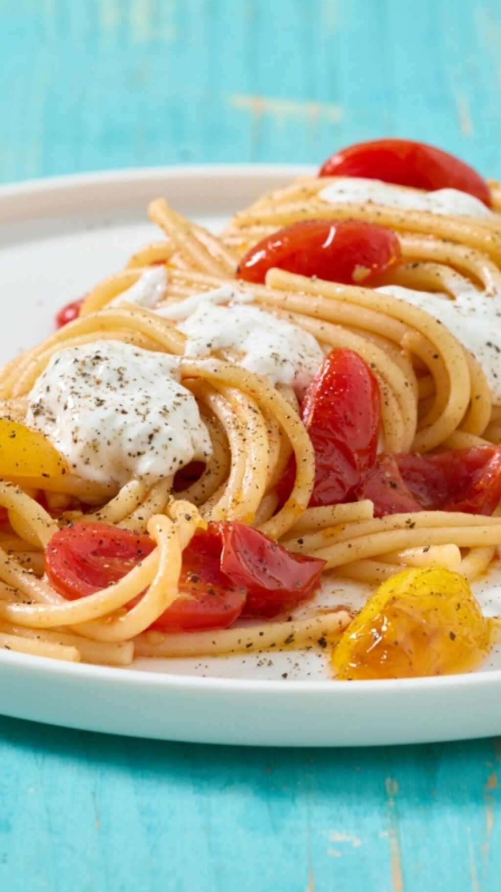 Se siete fan della burrata, la amerete ancora di più in questa pasta insieme ai pomodorini confit. Dolci e succosi, vanno a nozze con la cremosità della burrata, che rende questi spaghetti ancora più golosi.