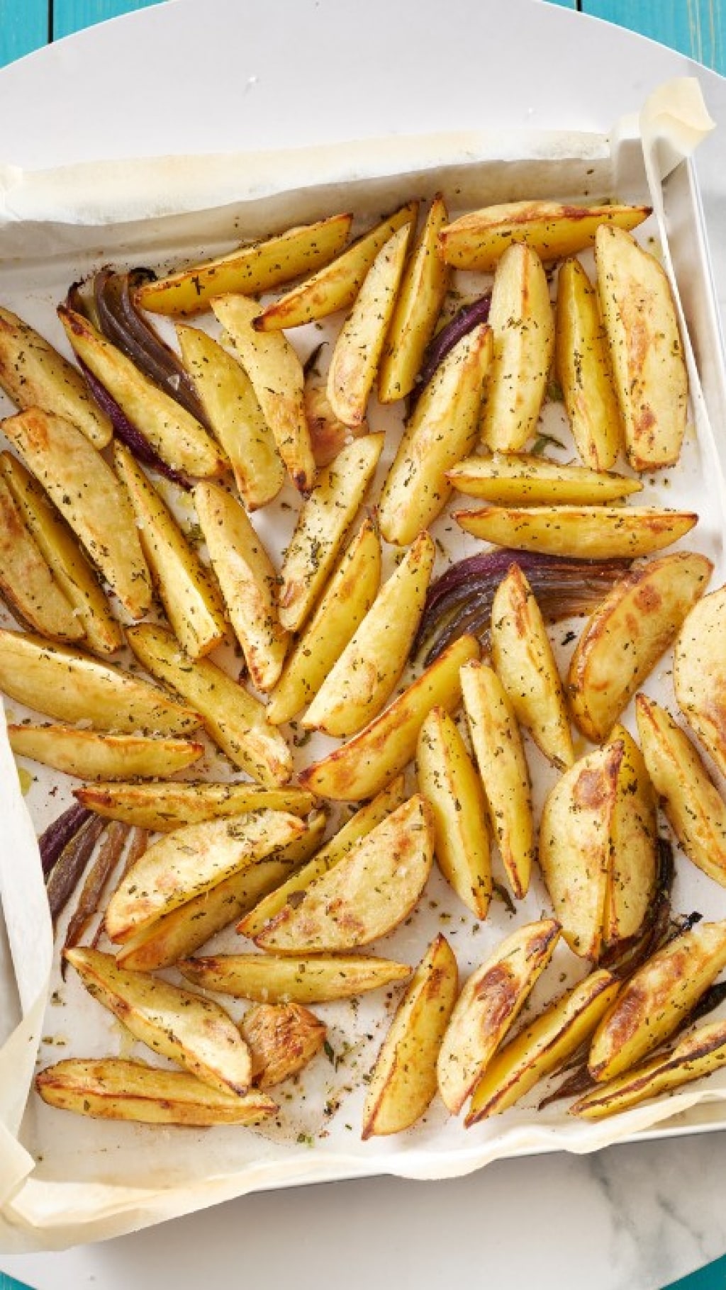 Per questa ricetta consigliamo patate a pasta gialla e soda. Lavate accuratamente e tagliate a spicchi, vanno lasciate a bagno in acqua per mezz'ora e poi passate in forno con aglio, mezza cipolla e un trito profumato di erbe aromatiche miste.
