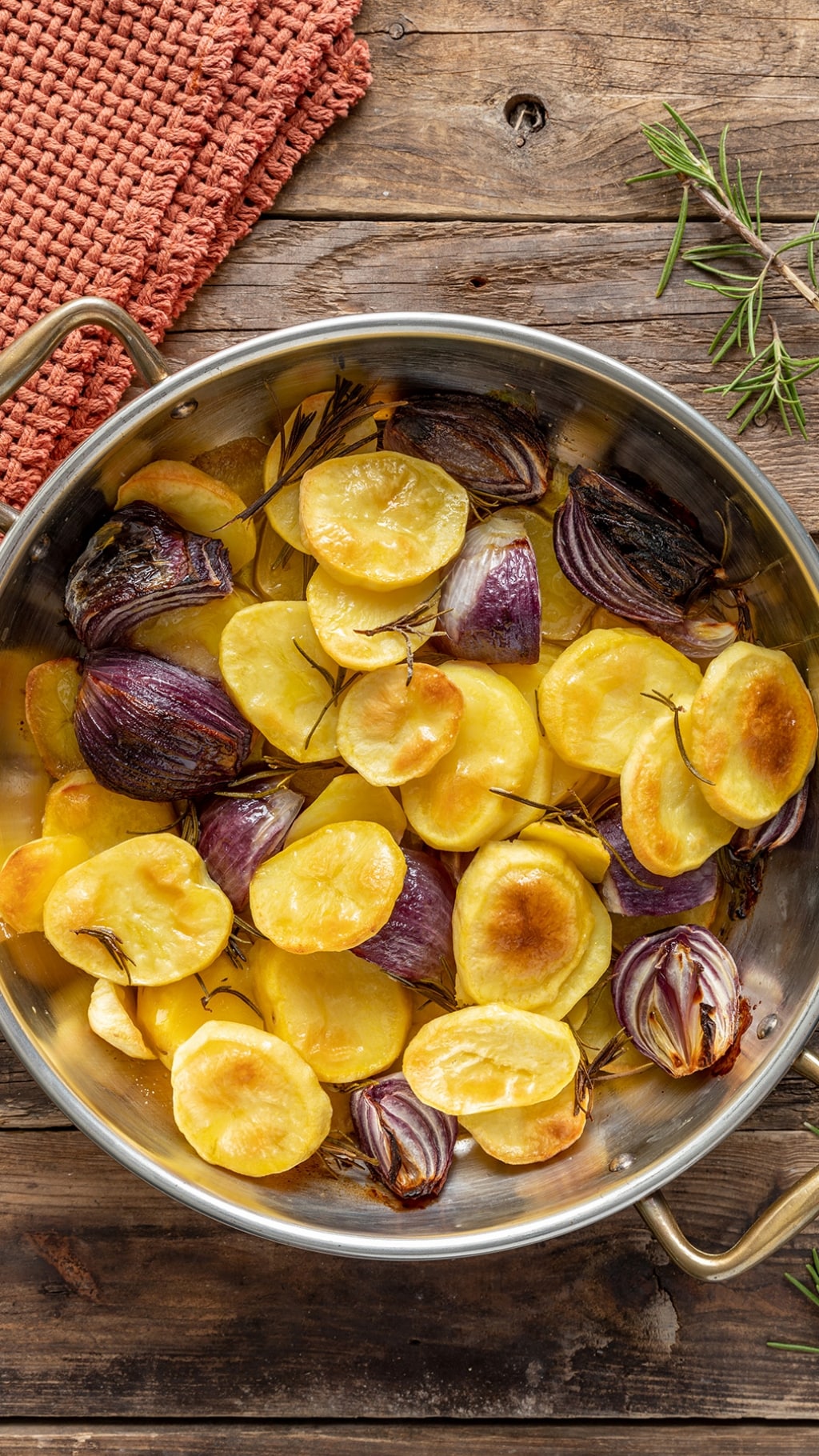 Tagliate le cipolle di Tropea in quarti o spicchi. In un tegame adatto alla cottura in forno unite le patate e le cipolle. Condite con abbondante olio e profumate con il rosmarino.