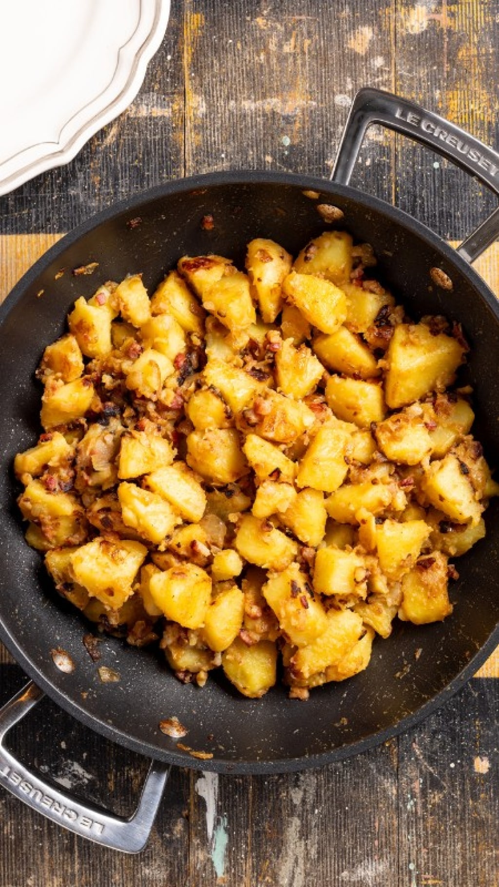 Quella delle patate in tecia è una ricetta friulana perfetta per scaldarsi nelle giornate più fredde. Si tratta di un contorno a base di patate, che vengono prima bollite e poi cotte in padella con burro, cipolla e pancetta.
