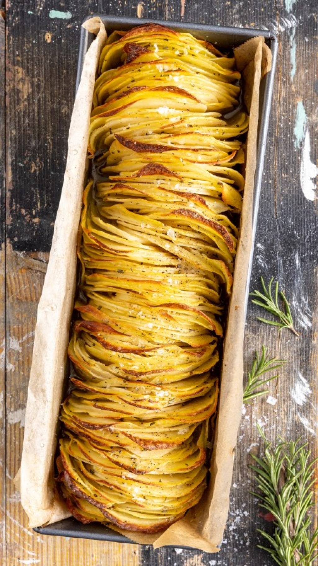 Foderate con carta forno uno stampo rettangolare (tipo quello da plumcake, da 31x11 cm) e disponetevi all’interno le rondelle di patate in verticale, affiancandole un po’ alla volta. Compattatele bene e infornate a 180° fino a cottura completa. Abbiate cura di controllare di tanto in tando l'avanzamento della cottura con l'aiuto di uno stecchino. Il risultato finale dovrà essere con le patate cotte internamente e croccanti in superficie. Ci vorranno quindi tra i 45 e i 60 minuti.