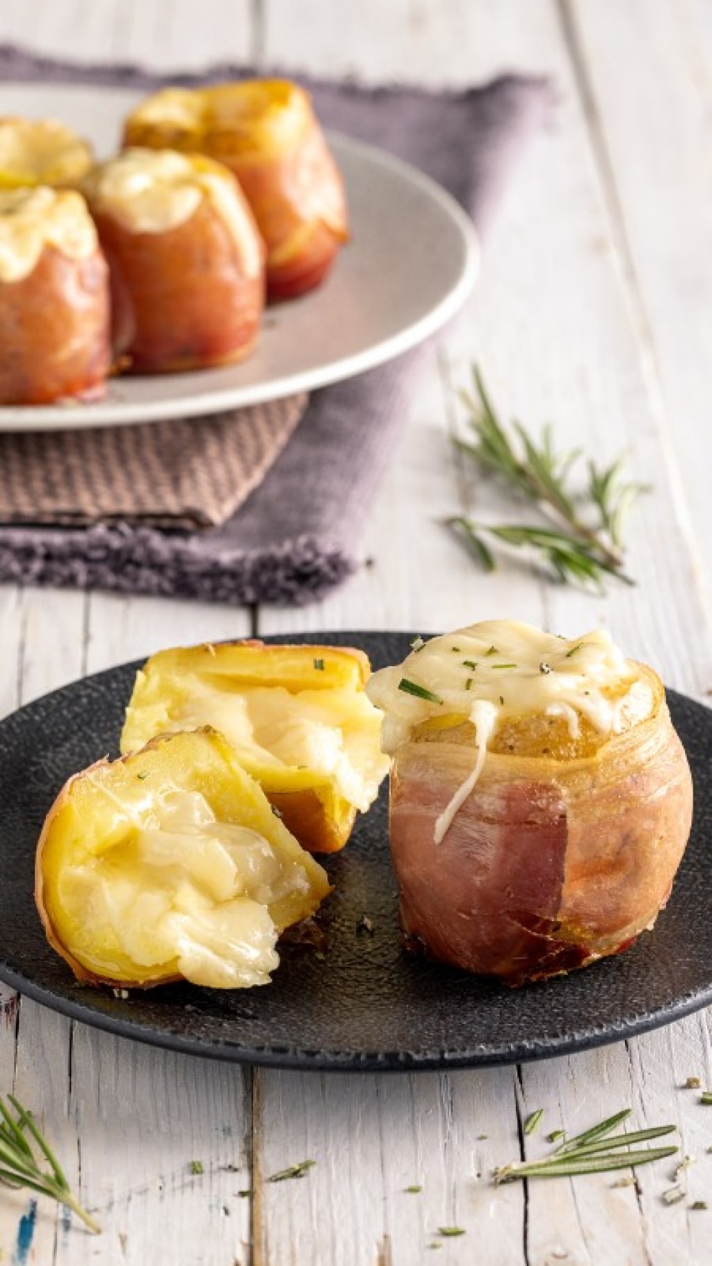 Una volta cotte e scavate le patate, seguendo le indicazioni della nostra ricetta, basterà avvolgerle nello speck. Vanno quindi farcite con il provolone piccante e infornate.
