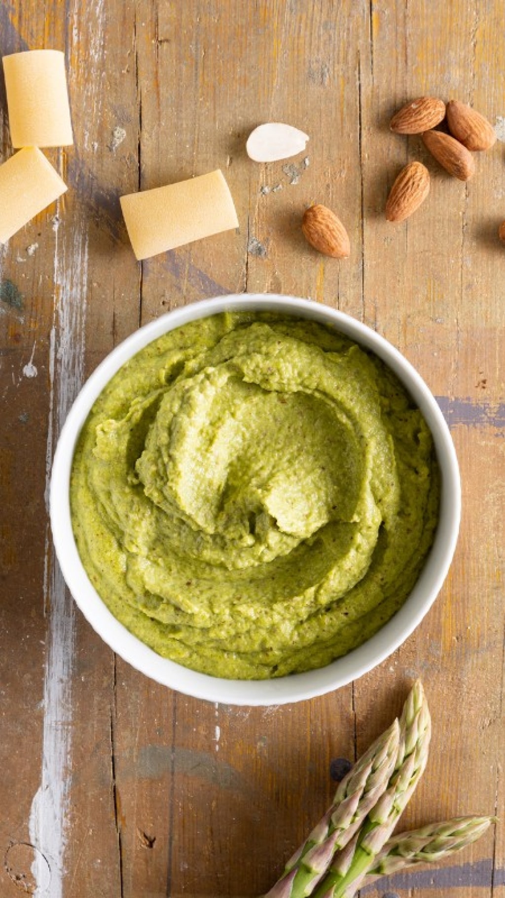 Prepararla è davvero semplice: una volta sbollentati gli asparagi si frullano insieme a un giro d'olio extravergine, mandorle tostate e dell'ottimo Parmigiano Reggiano stagionato almeno 24 mesi, che arricchisce l'insieme di sapidità e aromi. A piacere potete sostituire le mandorle con nocciole tostate.