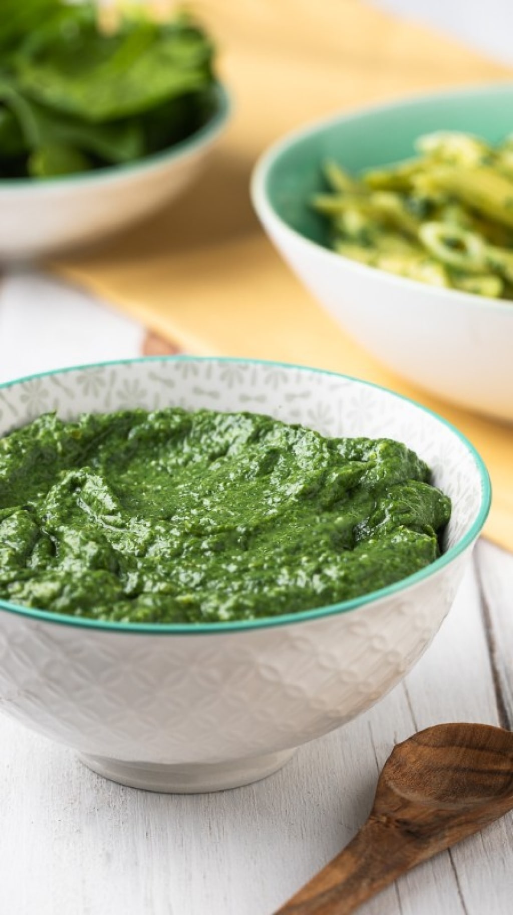 Il pesto di spinaci è una salsa cremosa e delicata. Pensato per condire la pasta, è buonissimo anche spalmato su tartine e bruschette. Una ricetta facilissima e veloce che risulta versatile perché ideale a pranzo, a cena e per l'aperitivo.