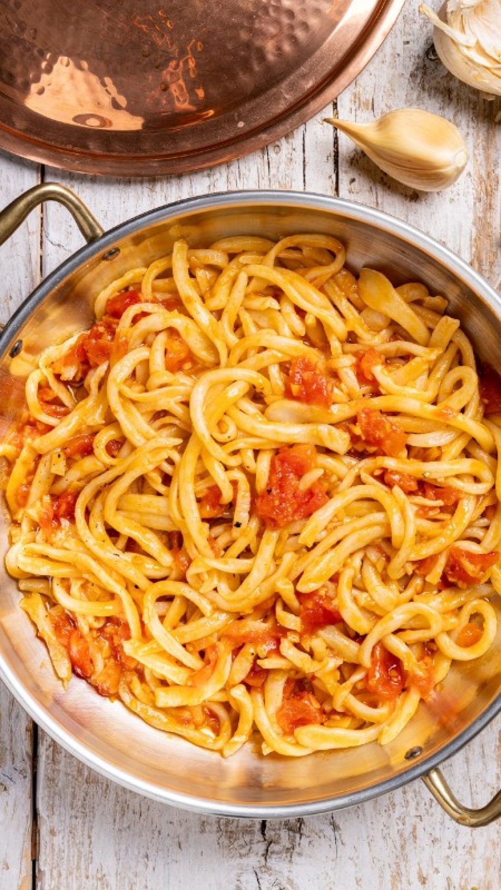 Nel frattempo cuocete i pici e una volta al dente passateli in padella per qualche minuto con il condimento per far amalgamare tutto. I pici all'aglione sono pronti per essere gustati.