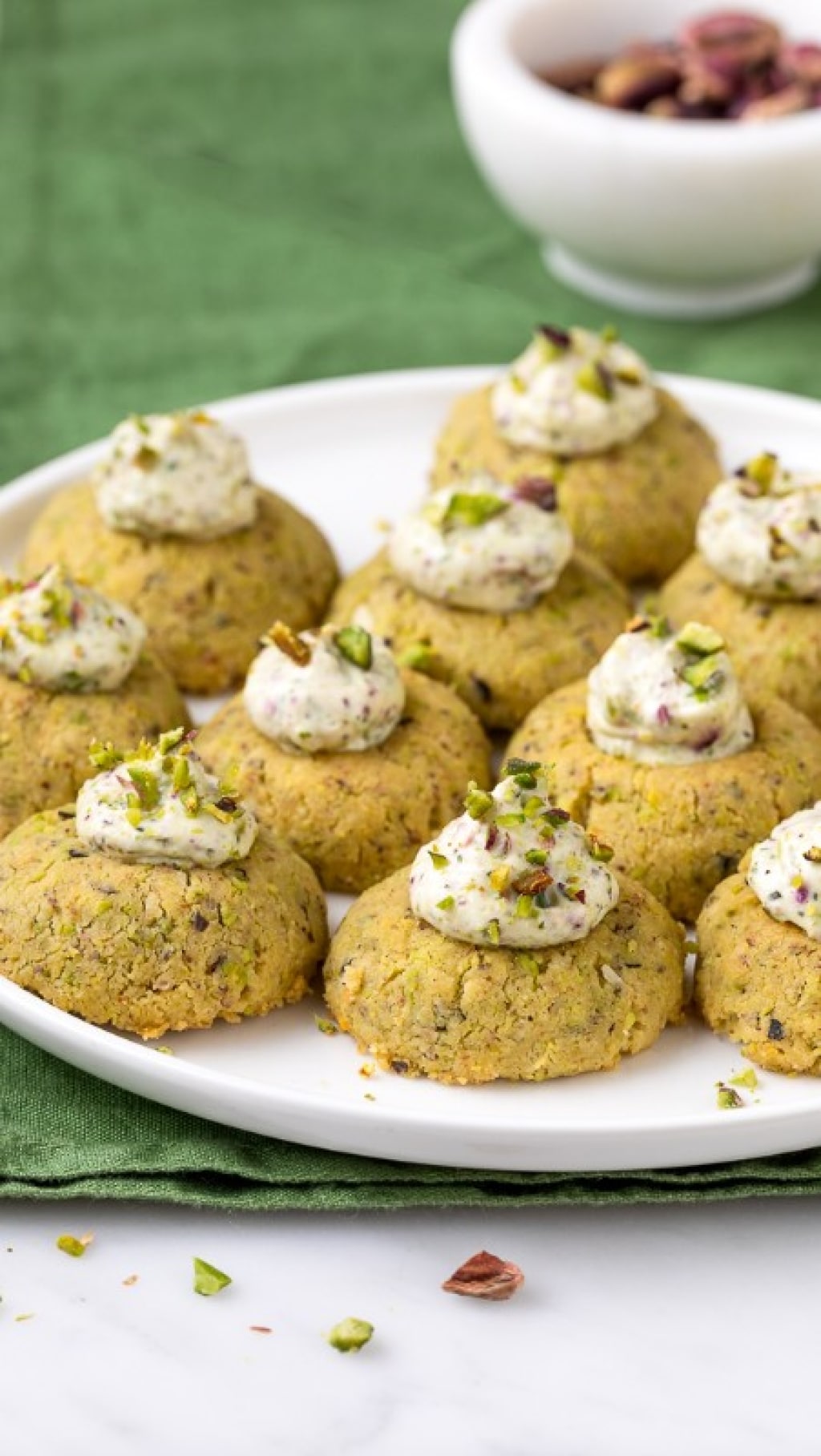 La ricetta per realizzare questi deliziosi salatini è semplice e anche piuttosto veloce pur dividendosi in due preparazioni diverse. L'impasto è una frolla burrosa ricca di pistacchi e saporita grazie alla presenza di pecorino e parmigiano stagionati. Per guarnire e rendere graziosi i pistacchiotti abbiamo realizzato una mousse di Philadelphia aromatizzato con menta, basilico e ancora pistacchi.
