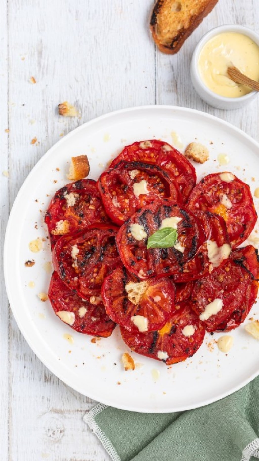 Scaldate molto bene una piastra di ghisa cosparsa con qualche goccia d'olio. Aggiungete i pomodori e lasciateli grigliare per 6-7 minuti solo da 1 lato. Ritirateli con una paletta e disponeteli su un piatto. Sempre sulla piastra grigliate anche le fette di pane fino a farle diventare dorate. Condite il piatto con la salsa preparata e servite i pomodori grigliati con qualche fogliolina di basilico fresco.