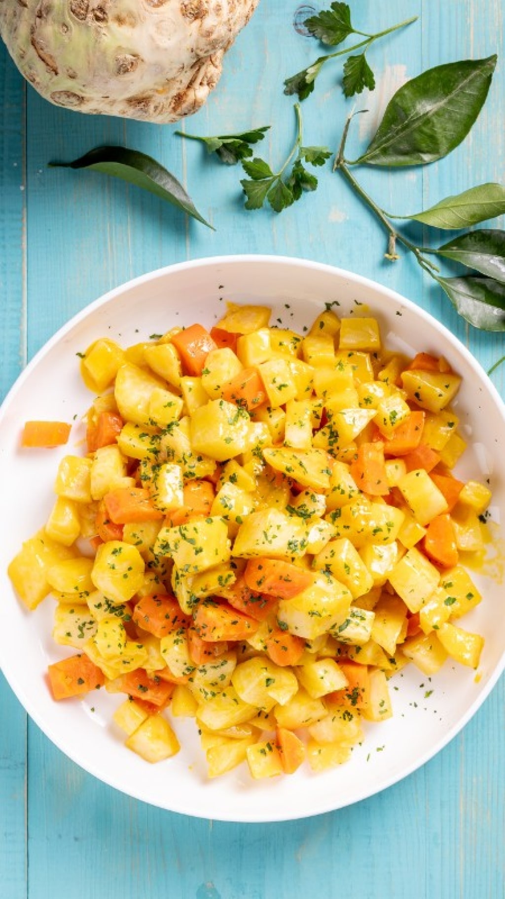ALTRE RICETTE GUSTOSE: Spuma di sedano rapa con sedano rapa a cubetti noci e curry, Insalta di sedano rapa, Minestrone di sedano rapa, piselli, carote e pasta corta