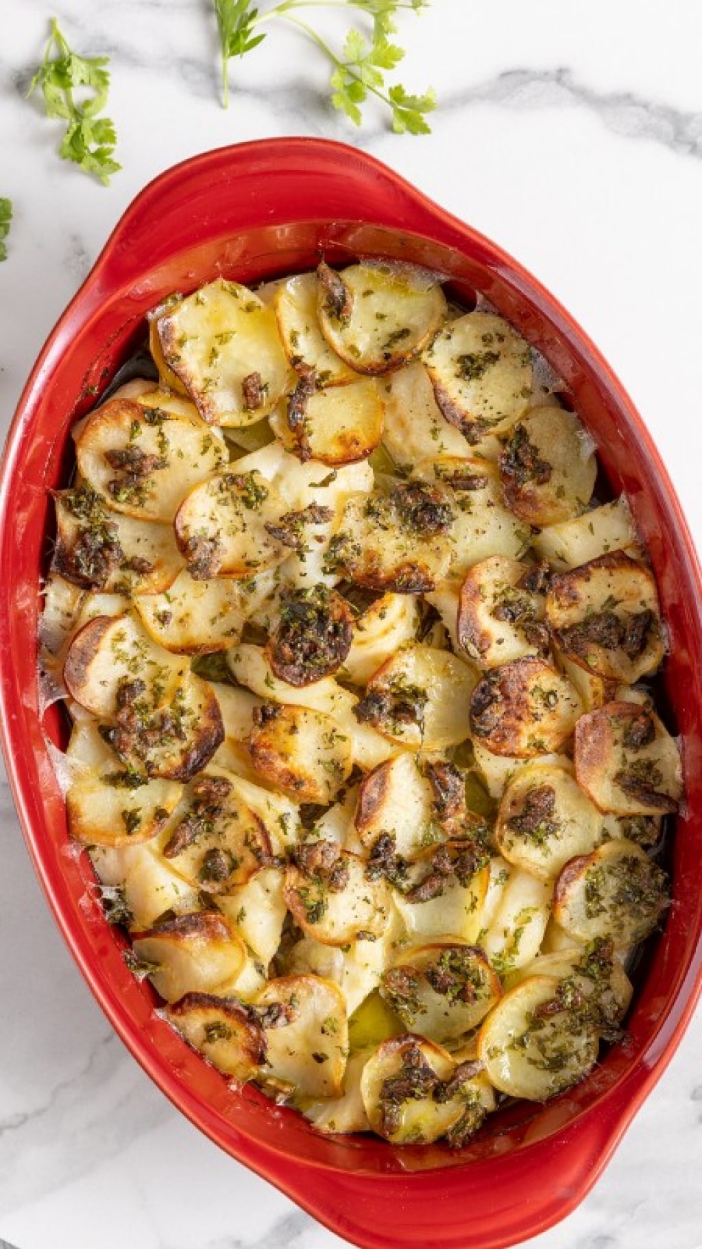 Si prepara disponendo in teglia strati alterni di patate a fettine e pezzi di pesce. La cottura avviene in forno e a conferire sapore al piatto è un condimento stuzzicante di acciughe e prezzemolo tritati e stemperati in olio extravergine di oliva.
