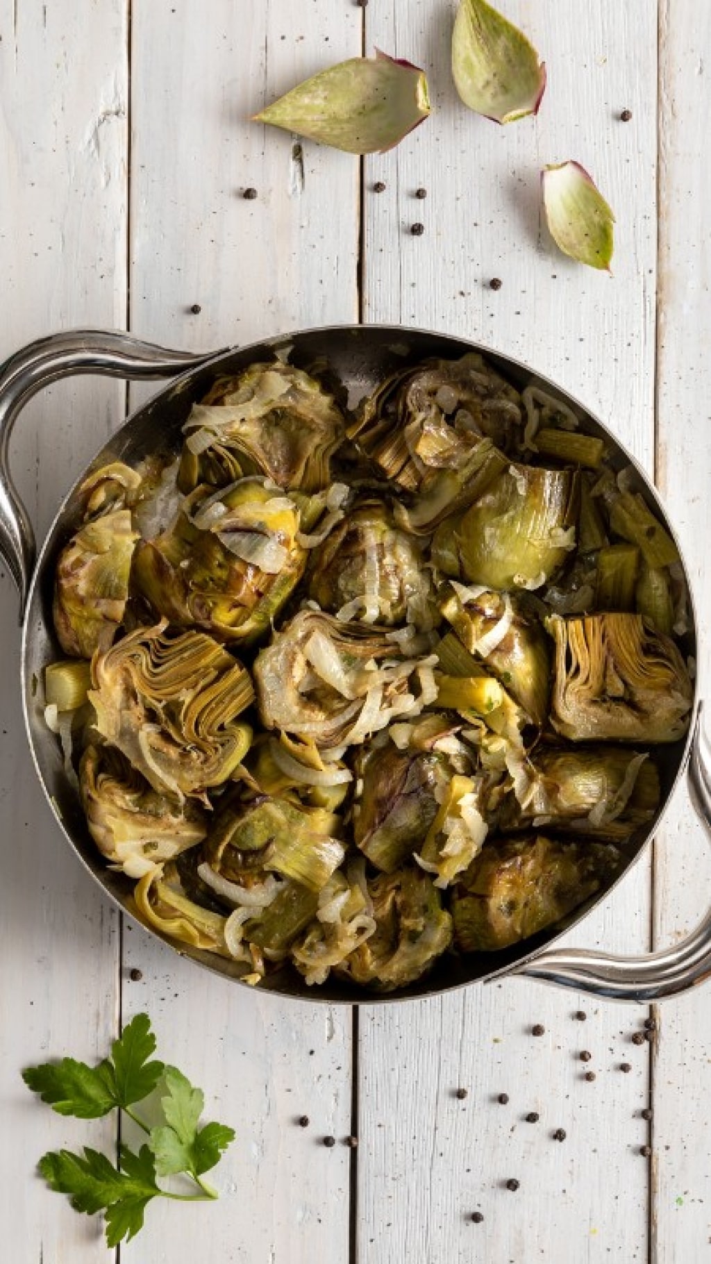 Quando sono diventate trasparenti unite i carciofi ben sgocciolati e il prezzemolo tritato, salate e pepate, mescolate, coprite e cuocete a fuoco moderato per circa 15 minuti aggiungendo, se occorre, qualche cucchiaio d’acqua calda. Togliete il coperchio e fate cuocere a fiamma più alta ancora qualche minuto per far asciugare un po’ il liquido di cottura. Ritirate carciofi e cipolle dal fuoco e serviteli subito.