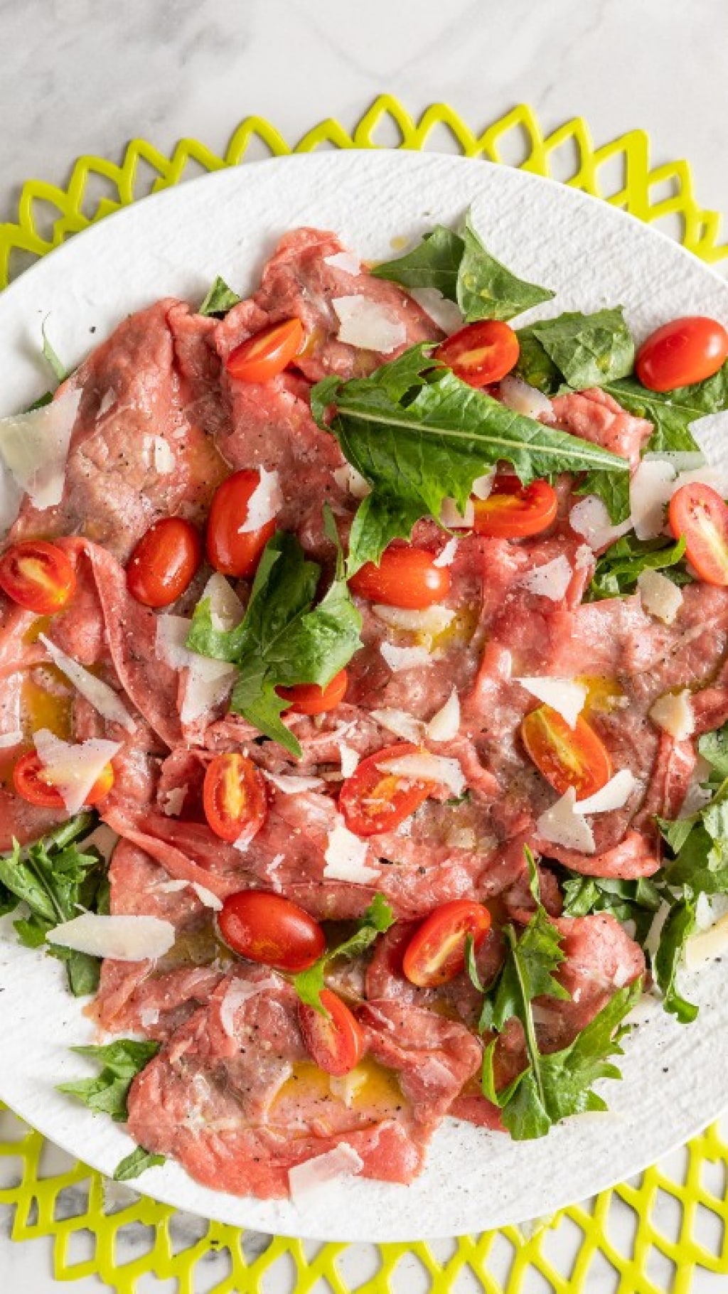 Questo carpaccio è un piatto gustoso a base di pochi ingredienti: carne di manzo tagliata finissima, pomodorini, scaglie di grana, pepe, olio, limone e rucola. Una ricetta facile e veloce che si adatta a ogni occasione: ottimo per un pranzo al volo, ma anche per una cena estiva tra amici o come antipasto.
