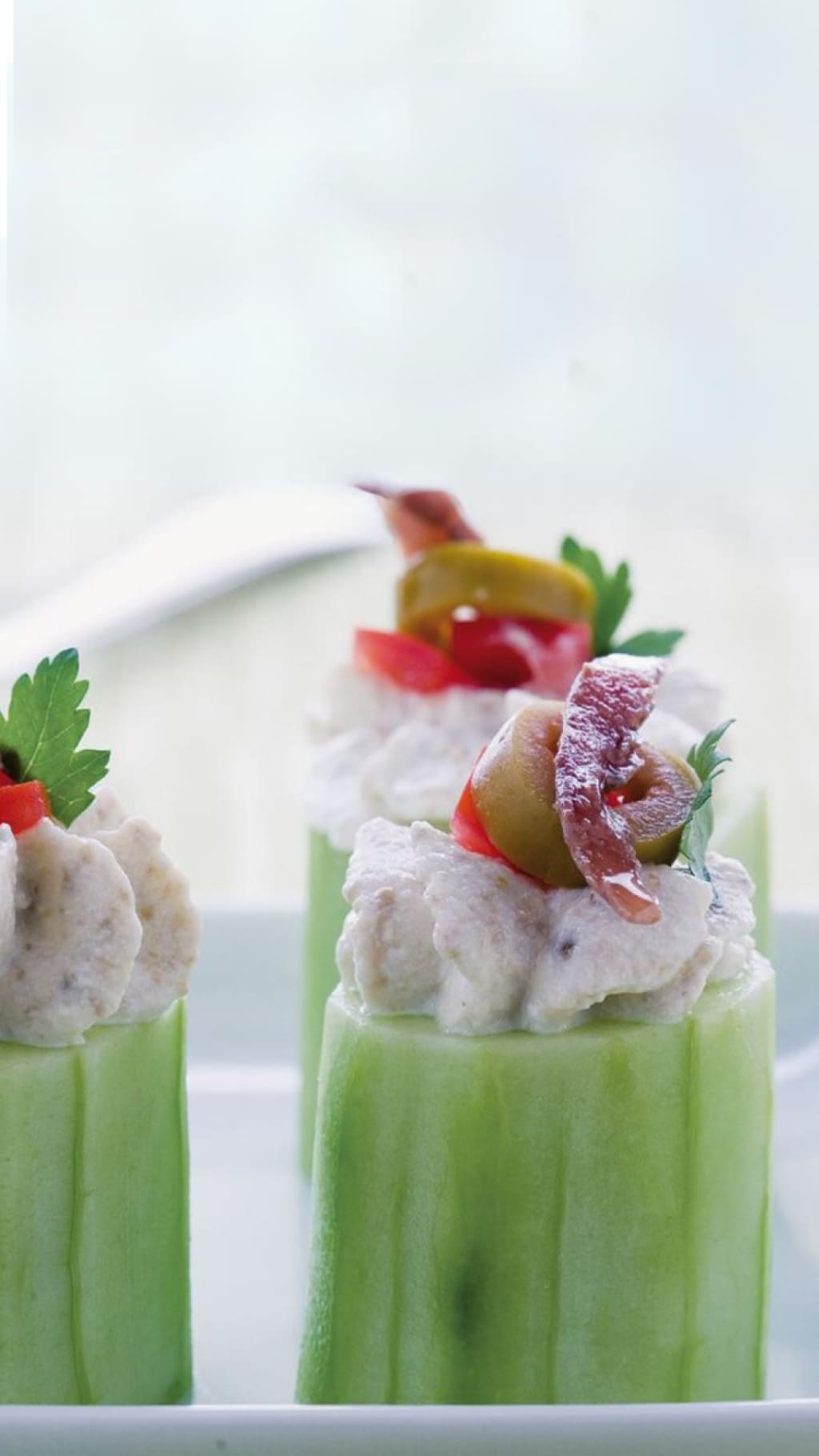 Nel frattempo, in una ciotola amalgamate la pasta d’olive con il formaggio spalmabile per poi trasferirla in una sac a poche con bocchetta spizzettata e, premendo con delicatezza, riempite i cetrioli. Guarnite con due-tre dadini di pomodoro, due rondelle di oliva, un filetto d’acciuga, foglie di prezzemolo e disponeteli su un piatto da portata. I vostri cetrioli alla crema di formaggi e pasta di olive sono pronti per essere serviti. Se non li consumate subito teneteli al fresco fino al momento di servire.