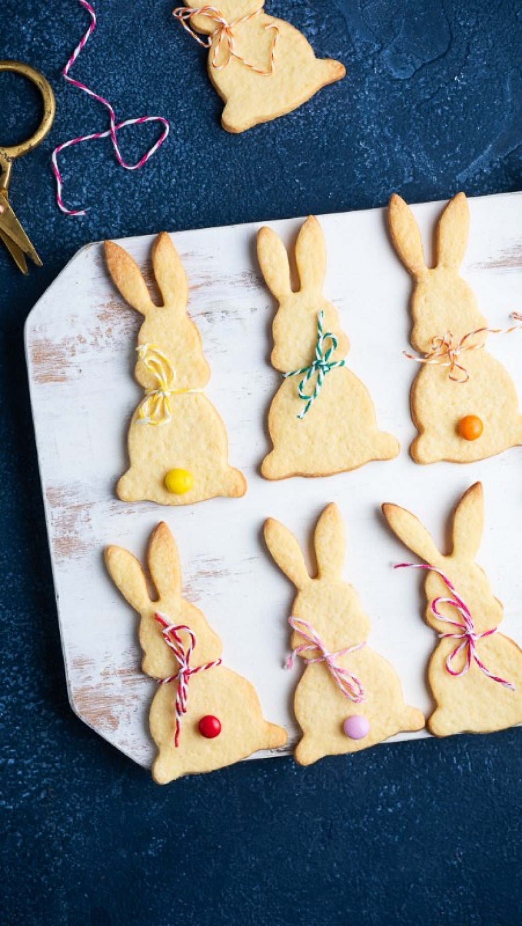 Cuocete i biscotti, infornando una teglia alla volta, nel forno preriscaldato a 180° per circa 12-15 minuti o fino a doratura. Sfornate e fate raffreddare completamente. Decorate i coniglietti di Pasqua a piacere con spago da cucina colorato e confettini.
