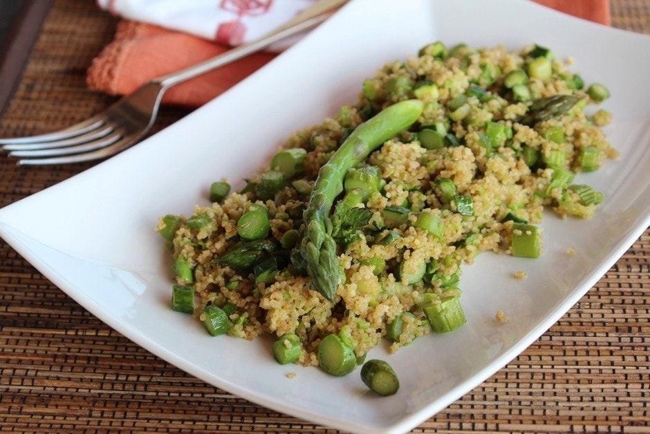Portiamo sul fuoco il cous cous con un cucchiaio d’olio, uniamo la crema di piselli e le verdure e saltiamo velocemente per far insaporire bene.