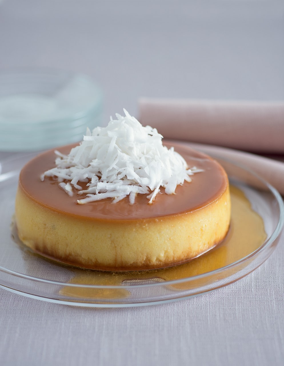 Staccate la polpa dal guscio del cocco, pelatela con un pelapatate per eliminare la pellicina marrone e grattugiatelo con una grattugia a fori grossi. Sformate il crème caramel sul piatto da portata e decoratelo con il cocco.