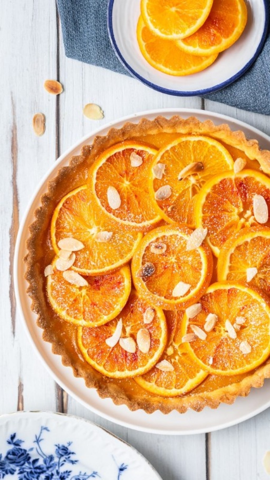 La crostata all'arancia è un dessert romantico e profumato. La base è una pasta frolla tradizionale, il ripieno una crema d'uovo all'arancia realizzata senza latte e sormontata da sottili fettine di arancia allo sciroppo come guarnizione..