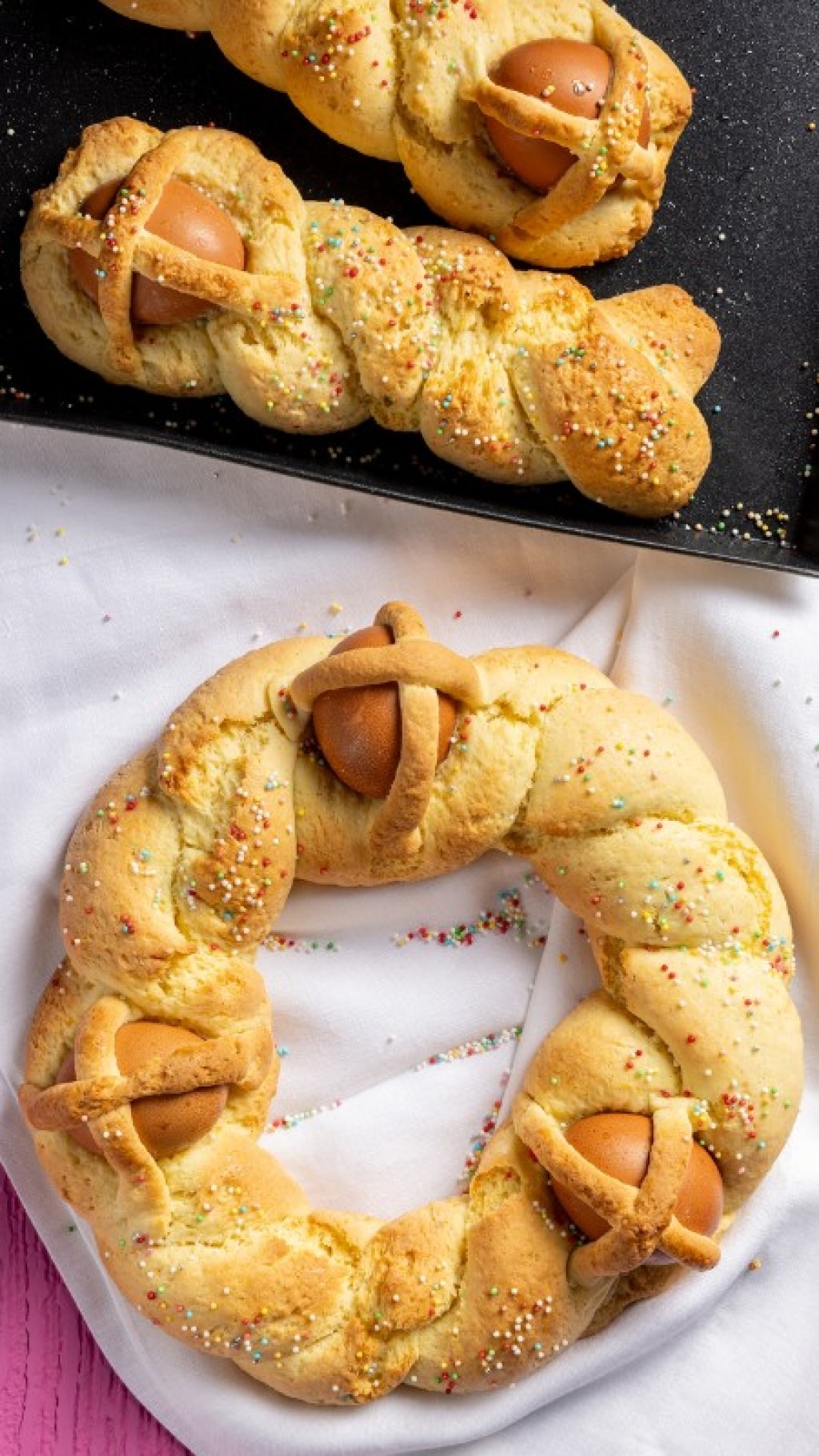 Una volta data la forma desiderata, aggiungete le uova a crudo (lavate e pulite) incastonandole nell’impasto e fermandole con due striscioline di pasta a croce ben fissate alla base. Prima di infornare spennellate con del latte e aggiungete gli zuccherini colorati in superficie.